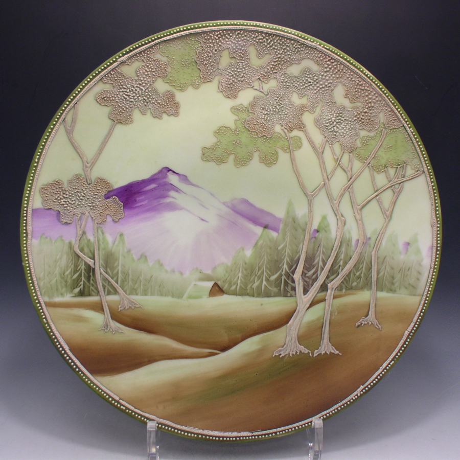 オールドノリタケのホワイトウッドランド飾皿です。1911年頃~1921年頃にアメリカに輸出され、約100年の時を経て日本に里帰りしてきました。オールドノリタケは現在のノリタケカンパニーが明治末期から戦前までに製造したアンティーク陶磁器の総称です。豪華絢爛な西洋風絵付け陶磁器は海外で人気を博しました。近年では、約100年という長い歳月を経て日本に里帰りしてきたことで、わが国でも大変人気が高くなっており、美術工芸品として高い地位を確保しつつあります。
