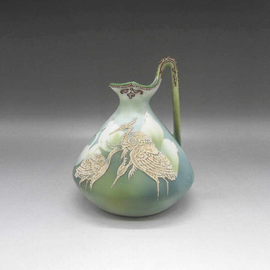 オールドノリタケの白鷺盛上水差しです。1891年頃~1915年頃にアメリカに輸出され、約100年の時を経て日本に里帰りしてきました。オールドノリタケは現在のノリタケカンパニーが明治末期から戦前までに製造したアンティーク陶磁器の総称です。豪華絢爛な西洋風絵付け陶磁器は海外で人気を博しました。近年では、約100年という長い歳月を経て日本に里帰りしてきたことで、わが国でも大変人気が高くなっており、美術工芸品として高い地位を確保しつつあります。