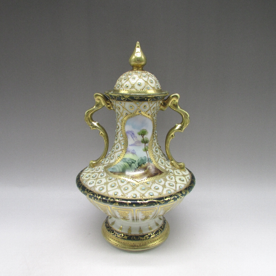 オールドノリタケのジュール風景文飾壺です。1891年頃~1915年頃にアメリカに輸出され、約100年の時を経て日本に里帰りしてきました。オールドノリタケは現在のノリタケカンパニーが明治末期から戦前までに製造したアンティーク陶磁器の総称です。豪華絢爛な西洋風絵付け陶磁器は海外で人気を博しました。近年では、約100年という長い歳月を経て日本に里帰りしてきたことで、わが国でも大変人気が高くなっており、美術工芸品として高い地位を確保しつつあります。