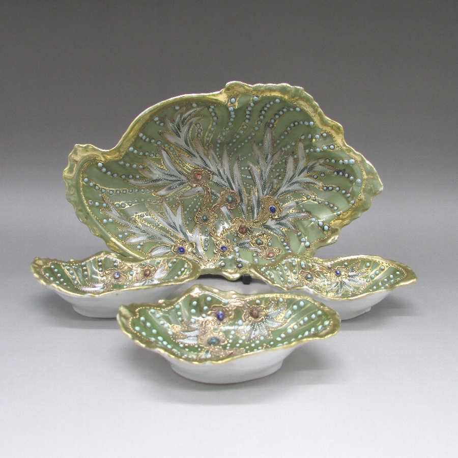 オールドノリタケの緑地先尖葉文ジュールナッツセットです。1891年頃~1915年頃にアメリカに輸出され、約100年の時を経て日本に里帰りしてきました。オールドノリタケは現在のノリタケカンパニーが明治末期から戦前までに製造したアンティーク陶磁器の総称です。豪華絢爛な西洋風絵付け陶磁器は海外で人気を博しました。近年では、約100年という長い歳月を経て日本に里帰りしてきたことで、わが国でも大変人気が高くなっており、美術工芸品として高い地位を確保しつつあります。