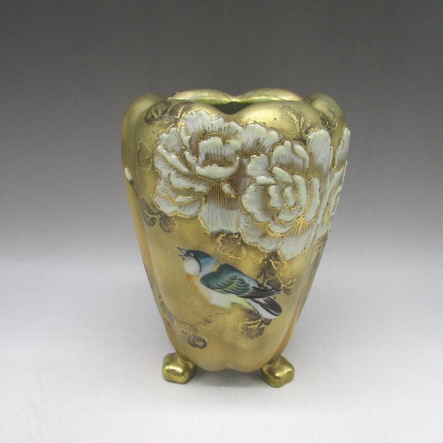 オールドノリタケのエナメルしゃくやく鳥文花瓶です。1891年頃~1915年頃にアメリカに輸出され、約100年の時を経て日本に里帰りしてきました。オールドノリタケは現在のノリタケカンパニーが明治末期から戦前までに製造したアンティーク陶磁器の総称です。豪華絢爛な西洋風絵付け陶磁器は海外で人気を博しました。近年では、約100年という長い歳月を経て日本に里帰りしてきたことで、わが国でも大変人気が高くなっており、美術工芸品として高い地位を確保しつつあります。