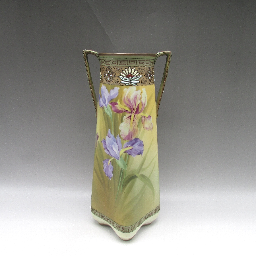 オールドノリタケのエナメル盛紫花文花瓶です。1911年頃~1921年頃にアメリカに輸出され、約100年の時を経て日本に里帰りしてきました。オールドノリタケは現在のノリタケカンパニーが明治末期から戦前までに製造したアンティーク陶磁器の総称です。豪華絢爛な西洋風絵付け陶磁器は海外で人気を博しました。近年では、約100年という長い歳月を経て日本に里帰りしてきたことで、わが国でも大変人気が高くなっており、美術工芸品として高い地位を確保しつつあります。