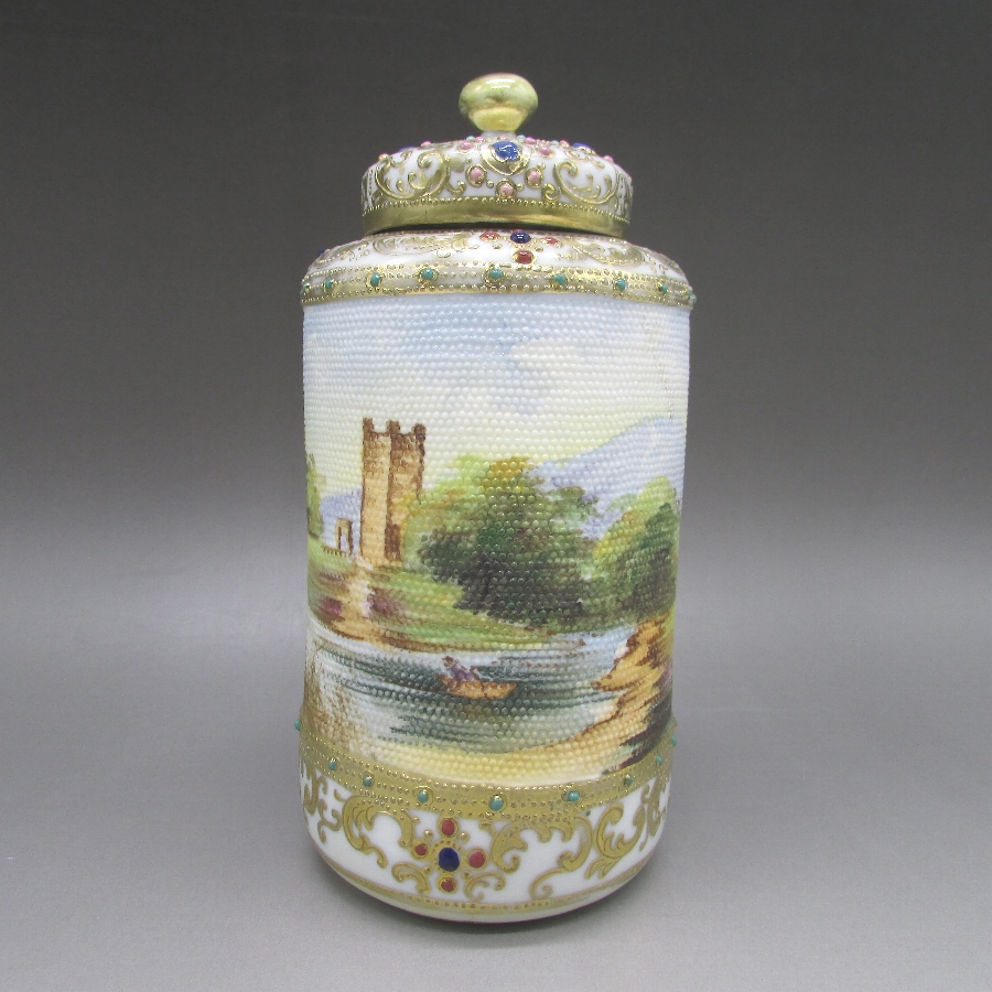 オールドノリタケのタペストリー古城文茶葉入れです。1891年頃~1915年頃にアメリカに輸出され、約100年の時を経て日本に里帰りしてきました。オールドノリタケは現在のノリタケカンパニーが明治末期から戦前までに製造したアンティーク陶磁器の総称です。豪華絢爛な西洋風絵付け陶磁器は海外で人気を博しました。近年では、約100年という長い歳月を経て日本に里帰りしてきたことで、わが国でも大変人気が高くなっており、美術工芸品として高い地位を確保しつつあります。