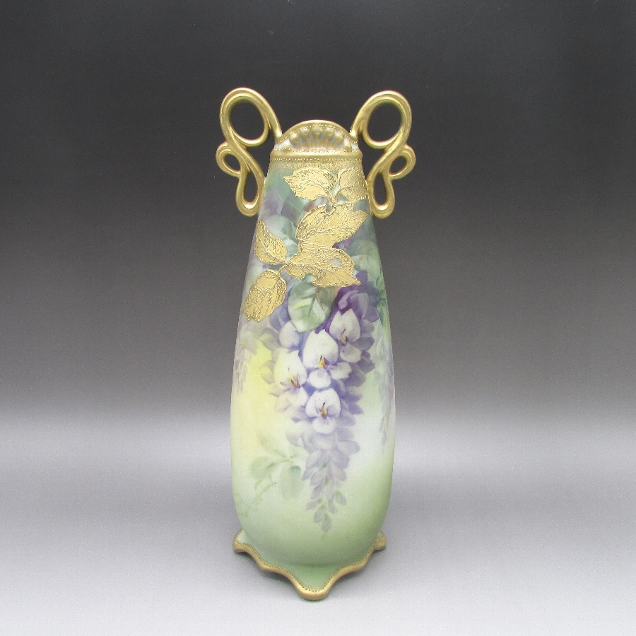 オールドノリタケの金盛下り藤文花瓶です。1891年頃~1915年頃にアメリカに輸出され、約100年の時を経て日本に里帰りしてきました。オールドノリタケは現在のノリタケカンパニーが明治末期から戦前までに製造したアンティーク陶磁器の総称です。豪華絢爛な西洋風絵付け陶磁器は海外で人気を博しました。近年では、約100年という長い歳月を経て日本に里帰りしてきたことで、わが国でも大変人気が高くなっており、美術工芸品として高い地位を確保しつつあります。