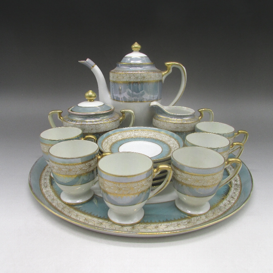 オールドノリタケの金彩草花文様デミタスセットです。1921年頃~1941年頃にアメリカに輸出され、約100年の時を経て日本に里帰りしてきました。オールドノリタケは現在のノリタケカンパニーが明治末期から戦前までに製造したアンティーク陶磁器の総称です。豪華絢爛な西洋風絵付け陶磁器は海外で人気を博しました。近年では、約100年という長い歳月を経て日本に里帰りしてきたことで、わが国でも大変人気が高くなっており、美術工芸品として高い地位を確保しつつあります。