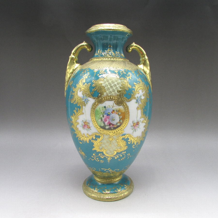 オールドノリタケの金盛り花文花瓶です。1891年頃~1915年頃にアメリカに輸出され、約100年の時を経て日本に里帰りしてきました。オールドノリタケは現在のノリタケカンパニーが明治末期から戦前までに製造したアンティーク陶磁器の総称です。豪華絢爛な西洋風絵付け陶磁器は海外で人気を博しました。近年では、約100年という長い歳月を経て日本に里帰りしてきたことで、わが国でも大変人気が高くなっており、美術工芸品として高い地位を確保しつつあります。