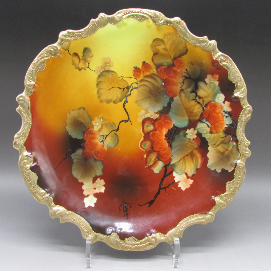 オールドノリタケのスグリ文皿です。1891年頃~1915年頃にアメリカに輸出され、約100年の時を経て日本に里帰りしてきました。オールドノリタケは現在のノリタケカンパニーが明治末期から戦前までに製造したアンティーク陶磁器の総称です。豪華絢爛な西洋風絵付け陶磁器は海外で人気を博しました。近年では、約100年という長い歳月を経て日本に里帰りしてきたことで、わが国でも大変人気が高くなっており、美術工芸品として高い地位を確保しつつあります。