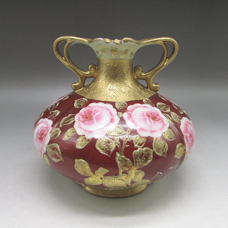 オールドノリタケの金盛薔薇文花瓶です。1891年頃~1915年頃にアメリカに輸出され、約100年の時を経て日本に里帰りしてきました。オールドノリタケは現在のノリタケカンパニーが明治末期から戦前までに製造したアンティーク陶磁器の総称です。豪華絢爛な西洋風絵付け陶磁器は海外で人気を博しました。近年では、約100年という長い歳月を経て日本に里帰りしてきたことで、わが国でも大変人気が高くなっており、美術工芸品として高い地位を確保しつつあります。