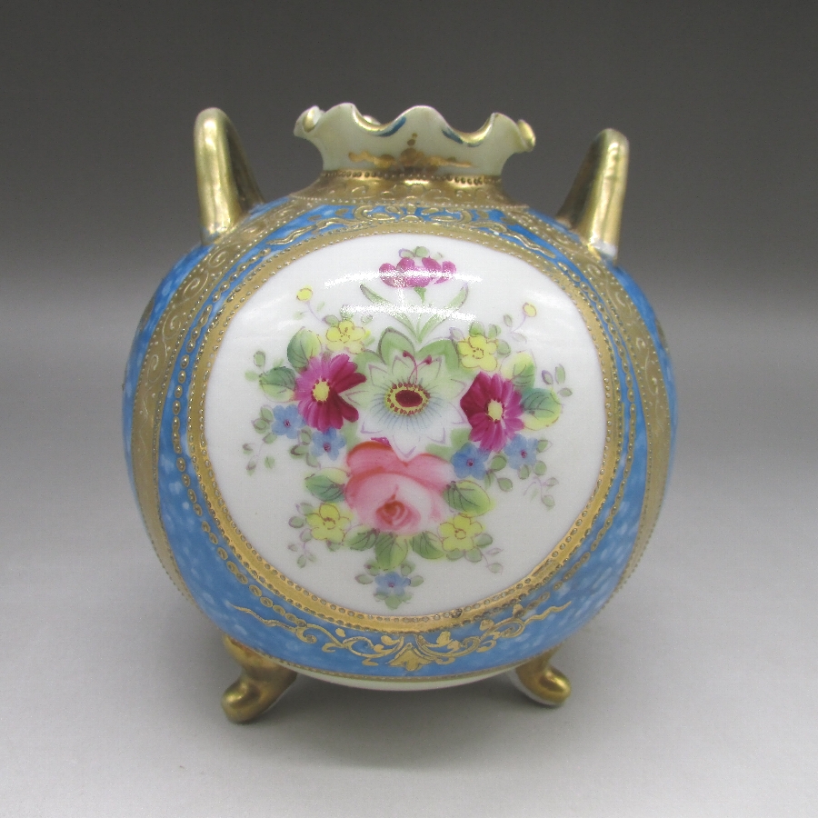 オールドノリタケの金彩薔薇文把手付花瓶です。1906年頃~1925年頃にイギリスに輸出され、約100年の時を経て日本に里帰りしてきました。オールドノリタケは現在のノリタケカンパニーが明治末期から戦前までに製造したアンティーク陶磁器の総称です。豪華絢爛な西洋風絵付け陶磁器は海外で人気を博しました。近年では、約100年という長い歳月を経て日本に里帰りしてきたことで、わが国でも大変人気が高くなっており、美術工芸品として高い地位を確保しつつあります。