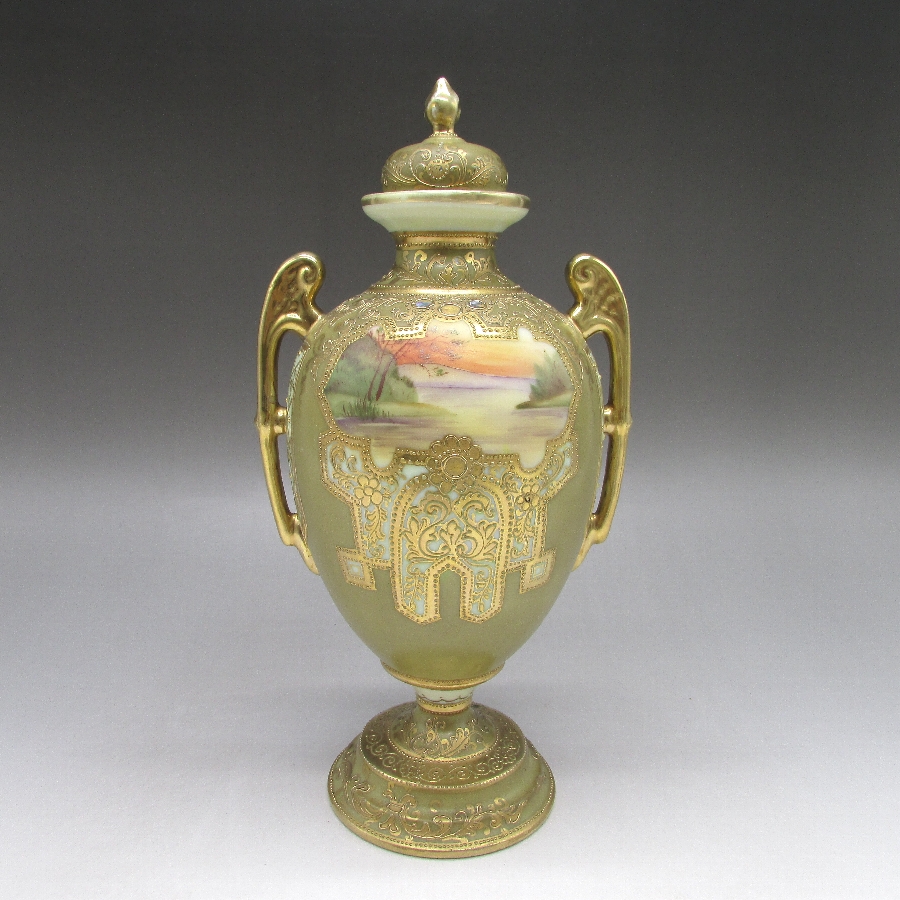 オールドノリタケの金盛り風景文飾壺です。1906年頃~1925年頃にイギリスに輸出され、約100年の時を経て日本に里帰りしてきました。オールドノリタケは現在のノリタケカンパニーが明治末期から戦前までに製造したアンティーク陶磁器の総称です。豪華絢爛な西洋風絵付け陶磁器は海外で人気を博しました。近年では、約100年という長い歳月を経て日本に里帰りしてきたことで、わが国でも大変人気が高くなっており、美術工芸品として高い地位を確保しつつあります。
