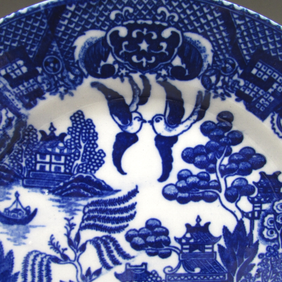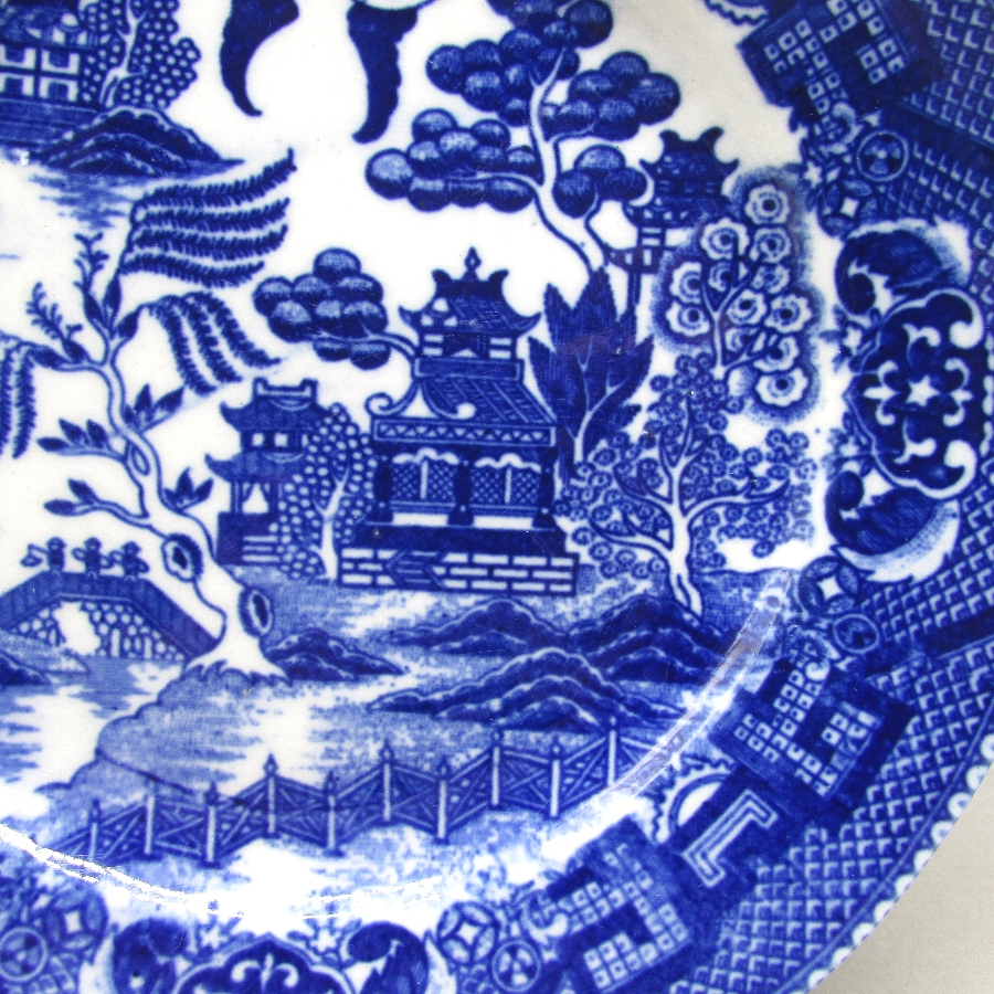 ウィロー・パターンとは英国人が中国の風景をイメージして英国の陶磁器に描いた柳文様のことです。ウィロー・パターンが誕生した1780年頃、英国の上流階級の間では、東洋のものが大流行!遠い東洋から輸入された、美しく高価な陶磁器に憧れる人がどんどん増えていきました。そこで、英国のいろんな窯では、東洋の陶磁器に描かれている絵の真似をした陶磁器を作り始めます。