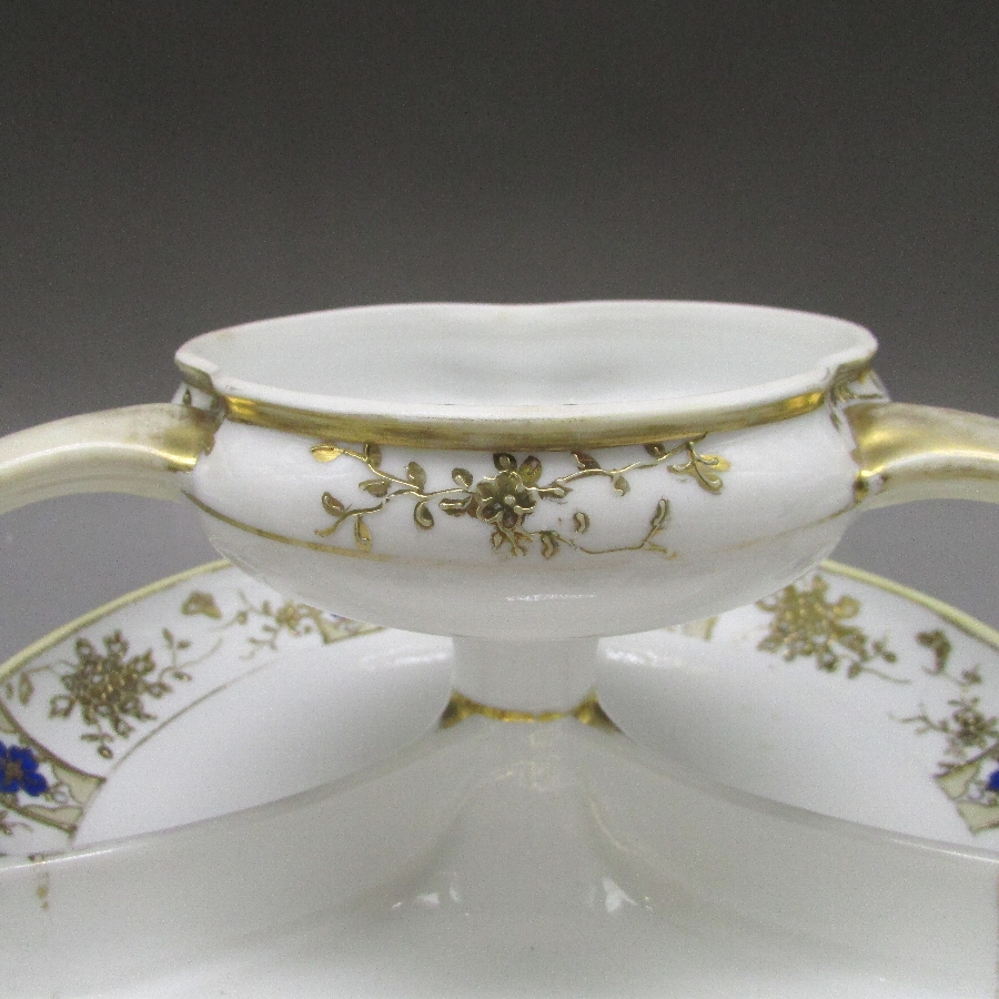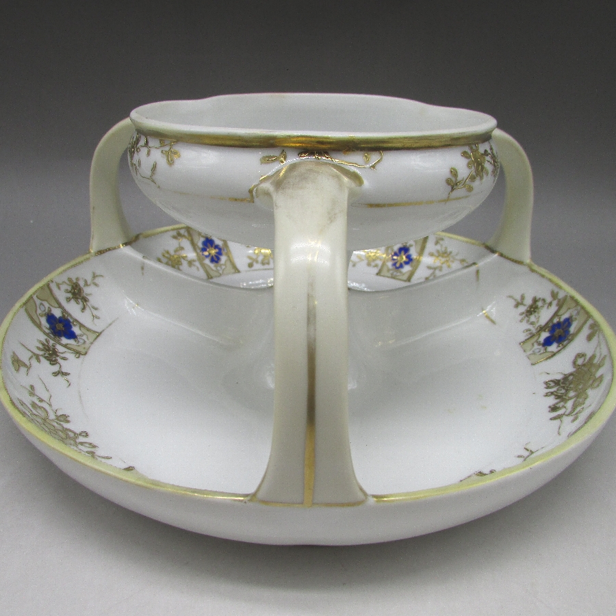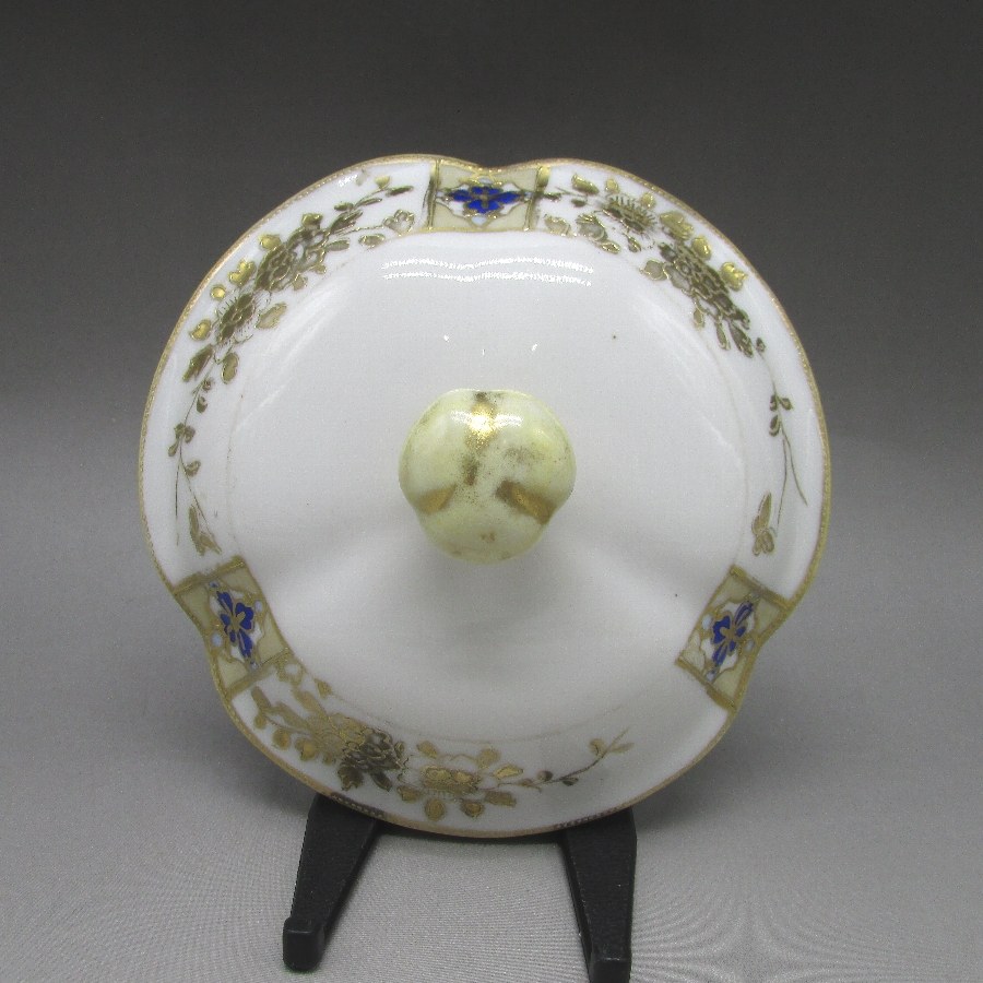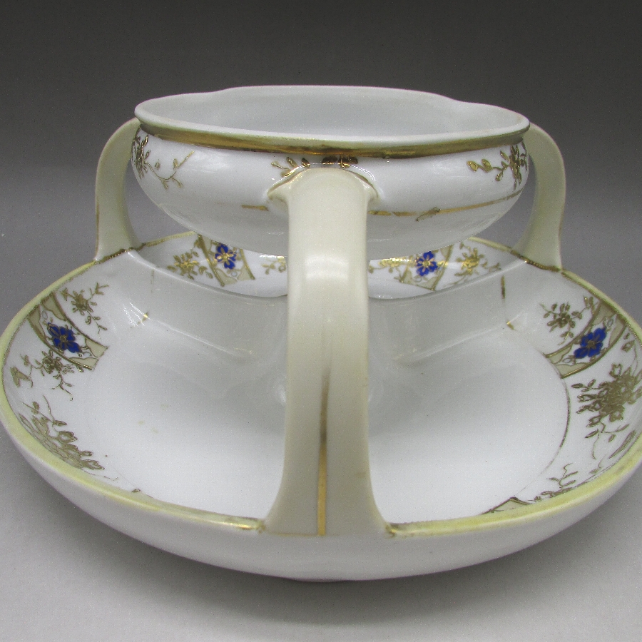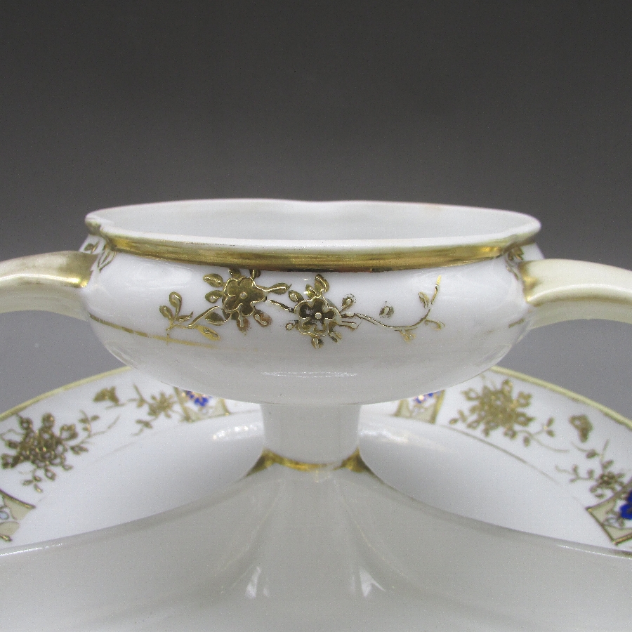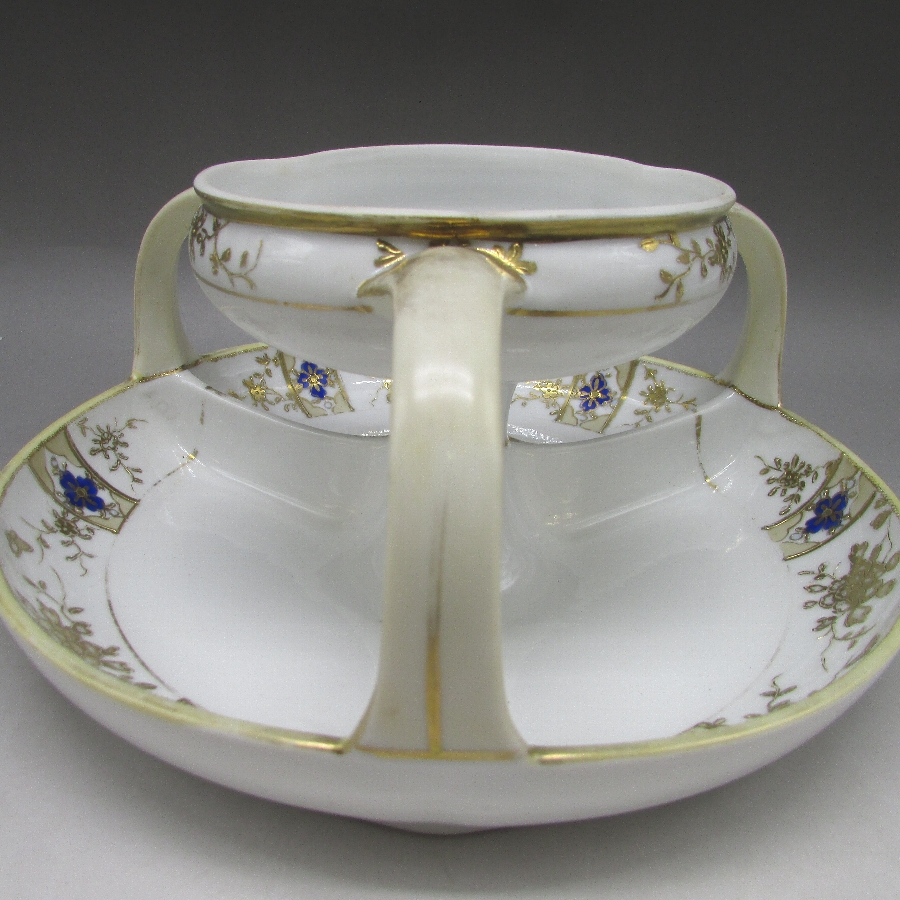 オールドノリタケの金彩唐草文チップディップです。1911年頃~1921年頃にアメリカに輸出され、約100年の時を経て日本に里帰りしてきました。オールドノリタケは現在のノリタケカンパニーが明治末期から戦前までに製造したアンティーク陶磁器の総称です。豪華絢爛な西洋風絵付け陶磁器は海外で人気を博しました。近年では、約100年という長い歳月を経て日本に里帰りしてきたことで、わが国でも大変人気が高くなっており、美術工芸品として高い地位を確保しつつあります。