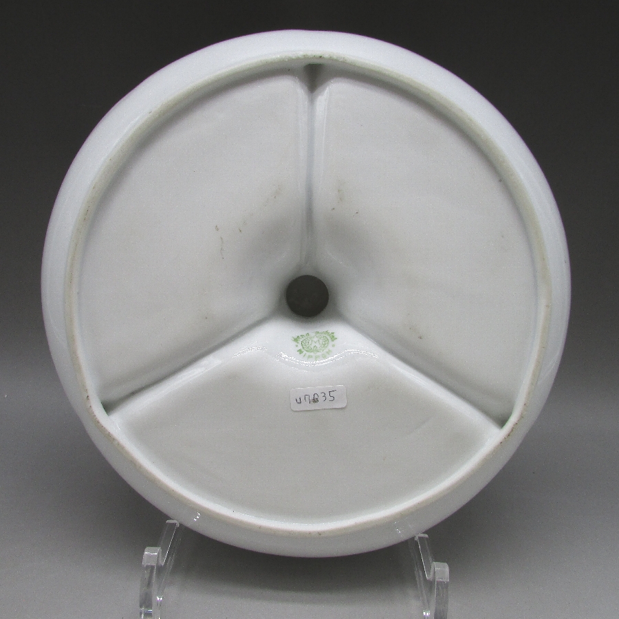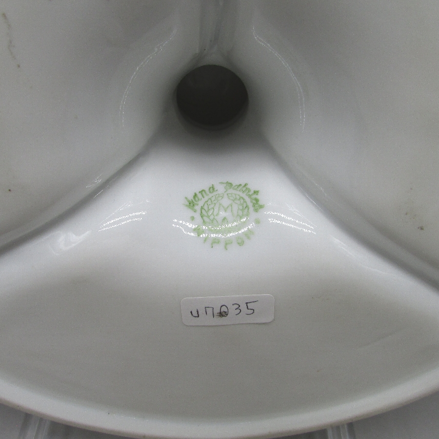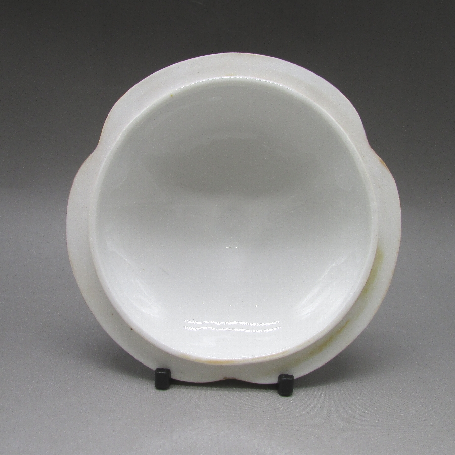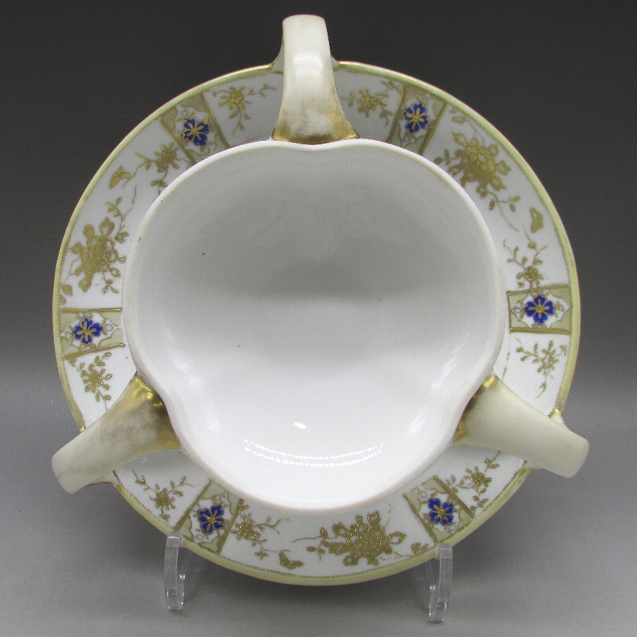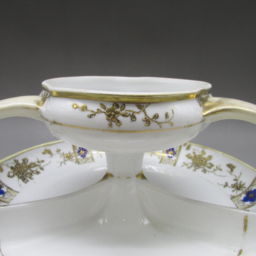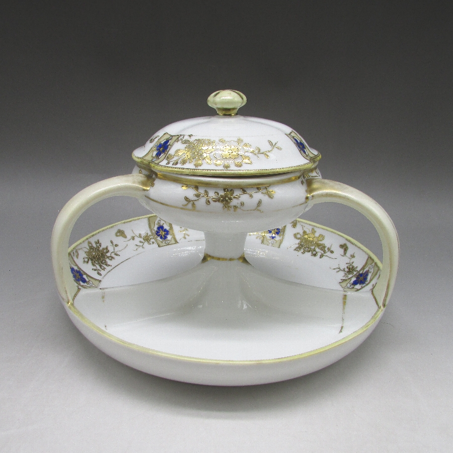 オールドノリタケの金彩唐草文チップディップです。1911年頃~1921年頃にアメリカに輸出され、約100年の時を経て日本に里帰りしてきました。オールドノリタケは現在のノリタケカンパニーが明治末期から戦前までに製造したアンティーク陶磁器の総称です。豪華絢爛な西洋風絵付け陶磁器は海外で人気を博しました。近年では、約100年という長い歳月を経て日本に里帰りしてきたことで、わが国でも大変人気が高くなっており、美術工芸品として高い地位を確保しつつあります。