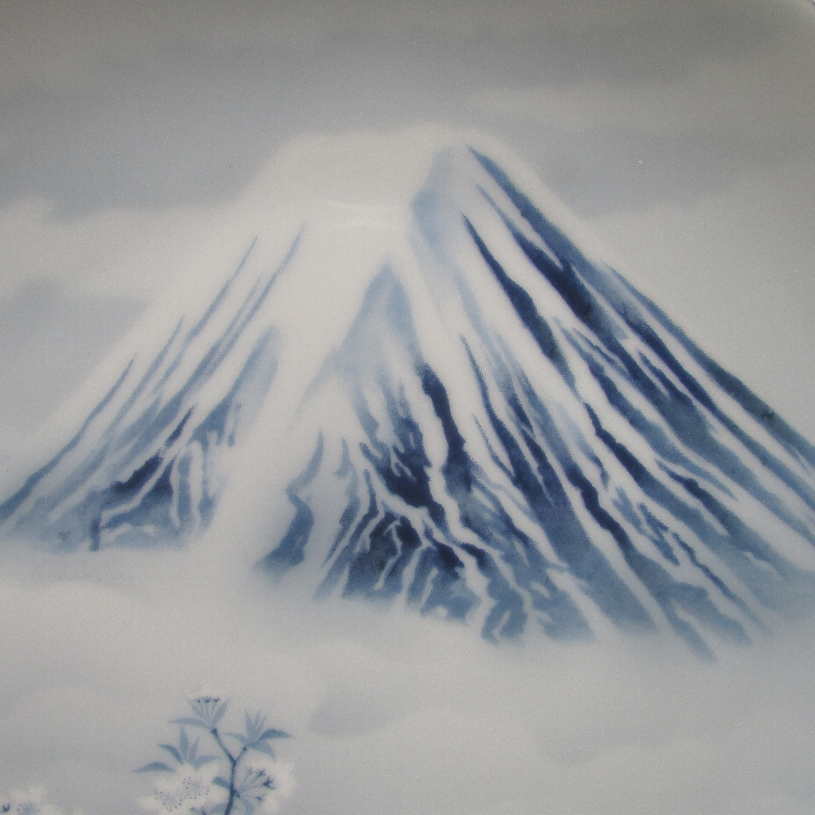 オールドノリタケの富士山文飾皿です。1911年頃~1941年頃に国内向けに製造されたものですが、約100年の時を経て日本に里帰りしてきました。オールドノリタケは現在のノリタケカンパニーが明治末期から戦前までに製造したアンティーク陶磁器の総称です。豪華絢爛な西洋風絵付け陶磁器は海外で人気を博しました。近年では、約100年という長い歳月を経て日本に里帰りしてきたことで、わが国でも大変人気が高くなっており、美術工芸品として高い地位を確保しつつあります。