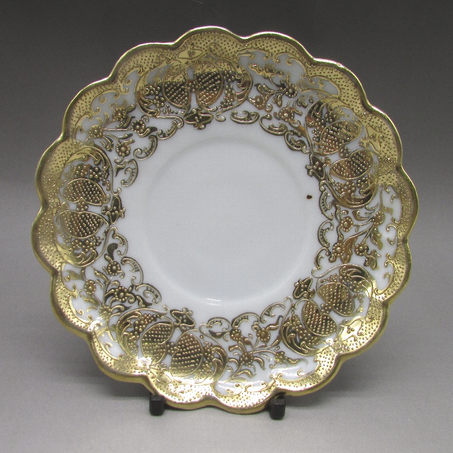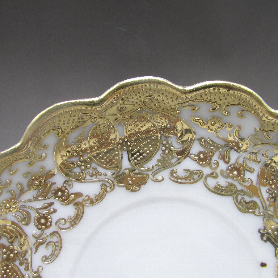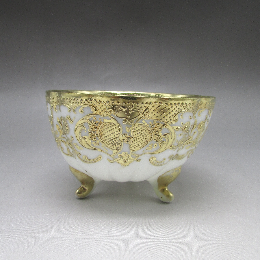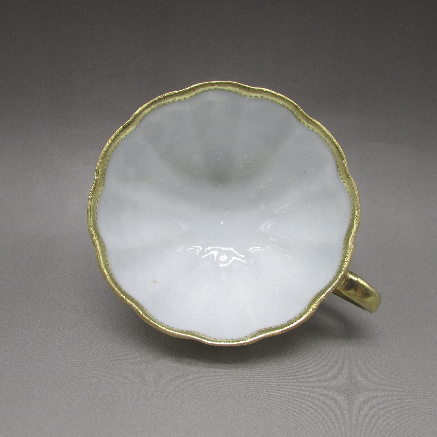オールドノリタケの金盛り唐草文足付カップ&ソーサーです。1891年頃~1915年頃にアメリカに輸出され、約100年の時を経て日本に里帰りしてきました。オールドノリタケは現在のノリタケカンパニーが明治末期から戦前までに製造したアンティーク陶磁器の総称です。豪華絢爛な西洋風絵付け陶磁器は海外で人気を博しました。近年では、約100年という長い歳月を経て日本に里帰りしてきたことで、わが国でも大変人気が高くなっており、美術工芸品として高い地位を確保しつつあります。