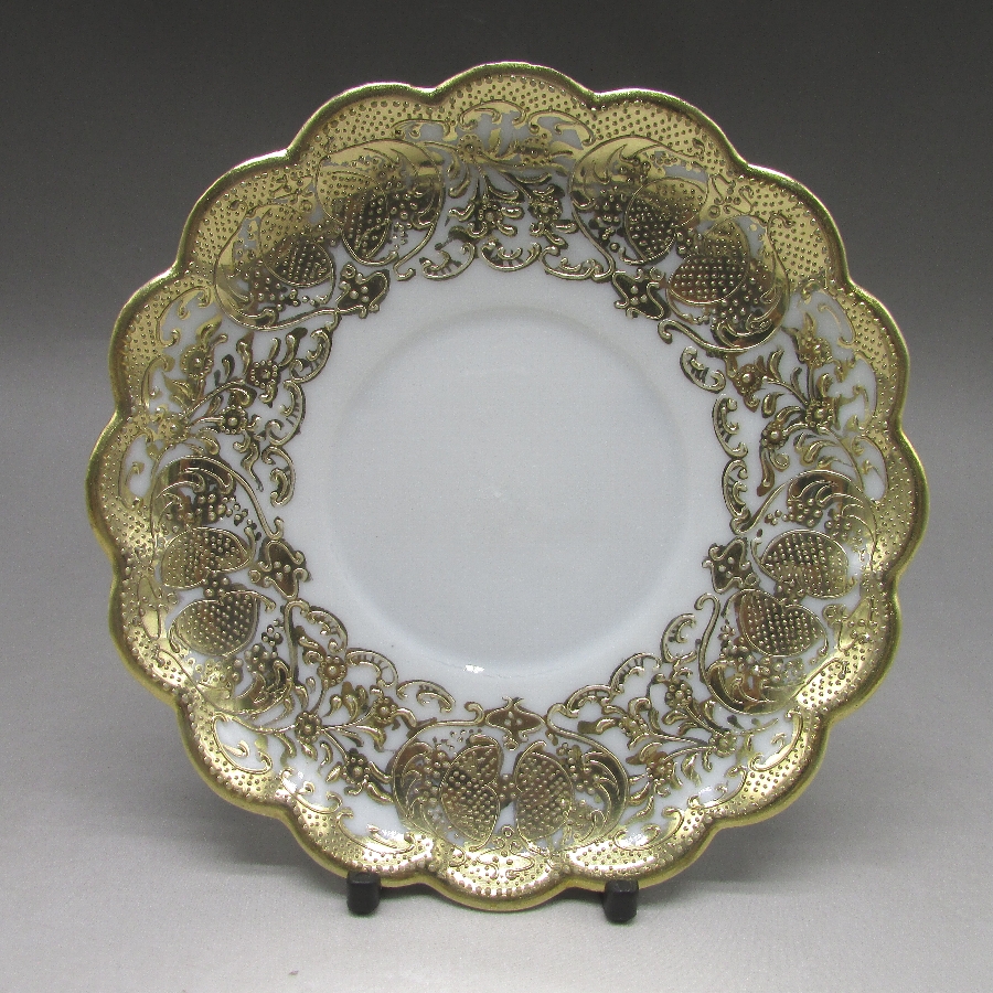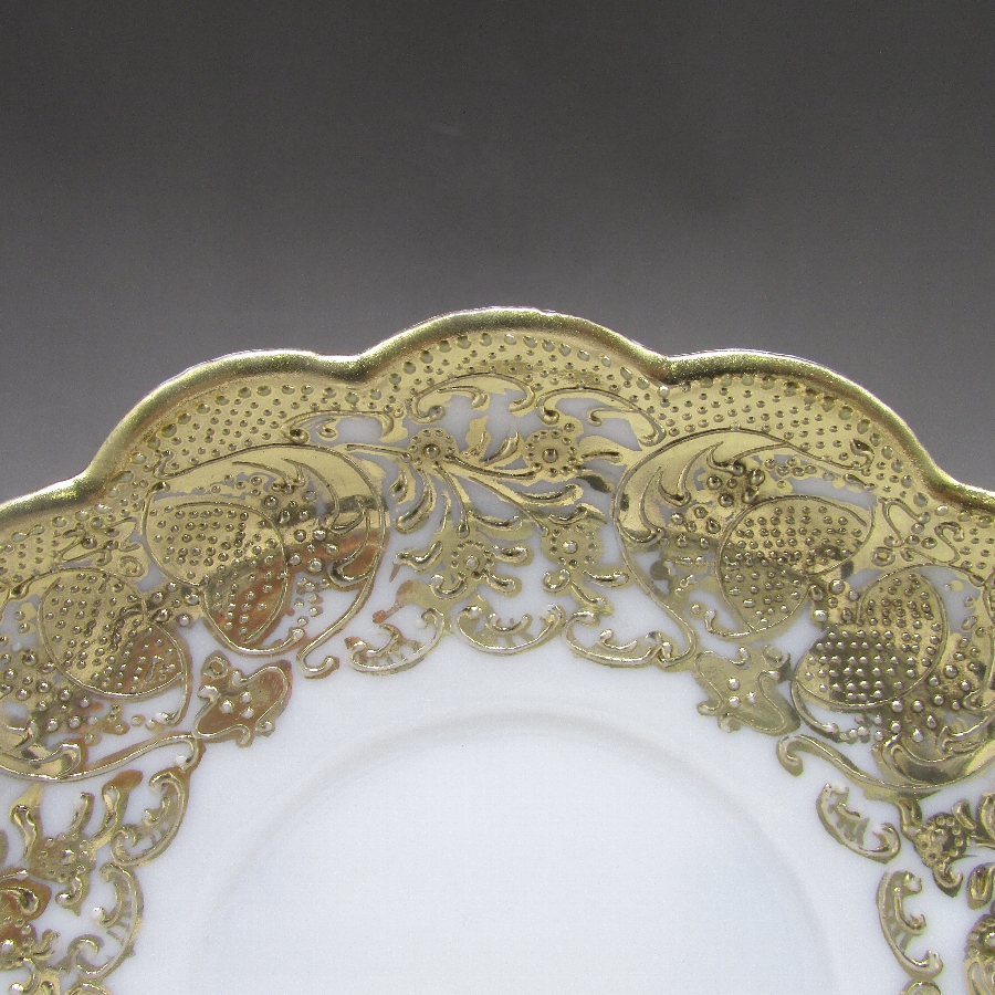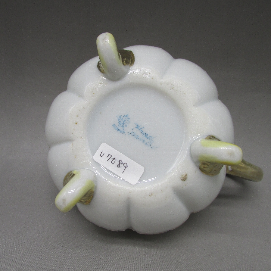 オールドノリタケの金盛り唐草文クリーマーです。1891年頃~1915年頃にアメリカに輸出され、約100年の時を経て日本に里帰りしてきました。オールドノリタケは現在のノリタケカンパニーが明治末期から戦前までに製造したアンティーク陶磁器の総称です。豪華絢爛な西洋風絵付け陶磁器は海外で人気を博しました。近年では、約100年という長い歳月を経て日本に里帰りしてきたことで、わが国でも大変人気が高くなっており、美術工芸品として高い地位を確保しつつあります。