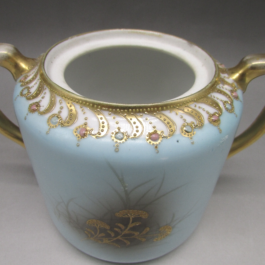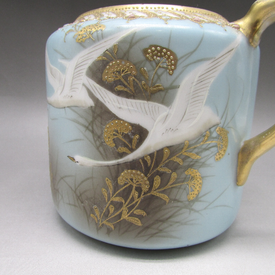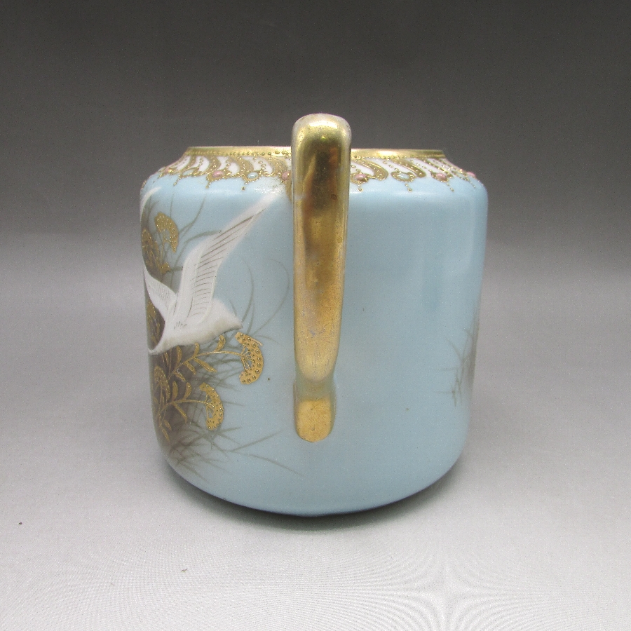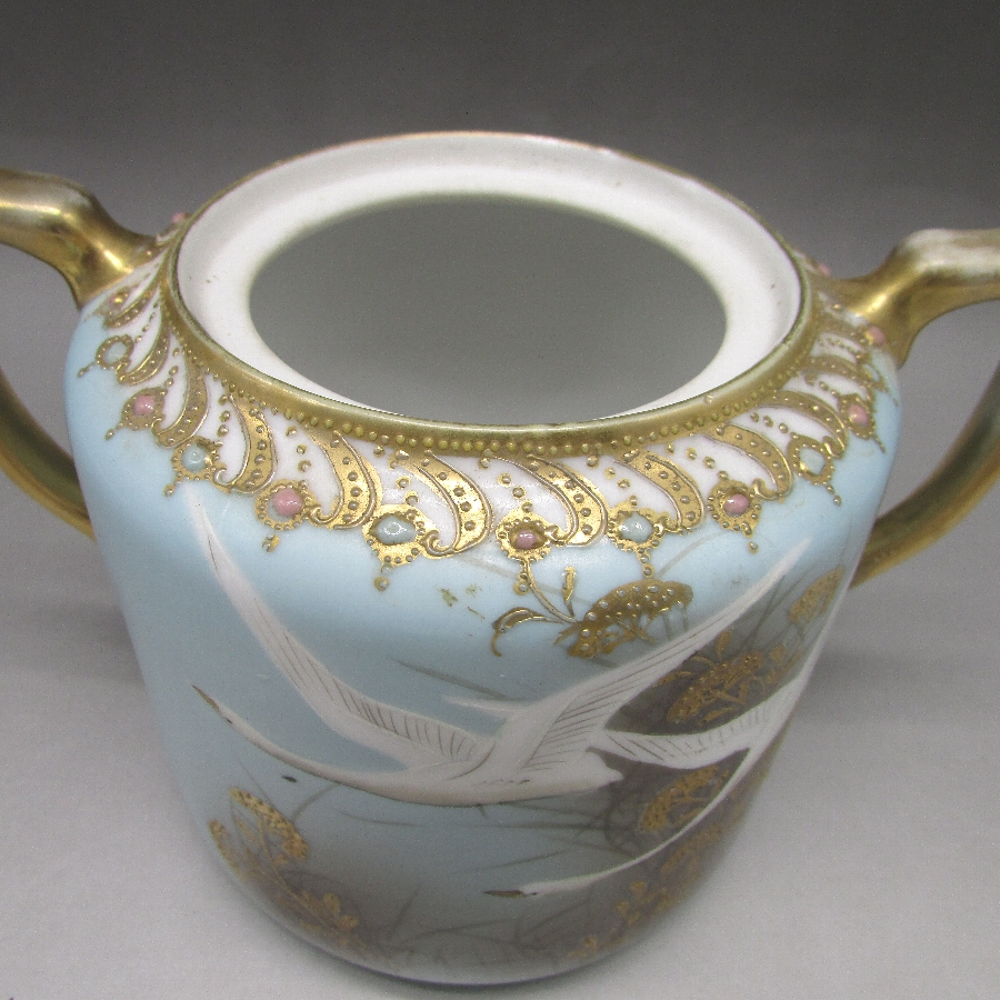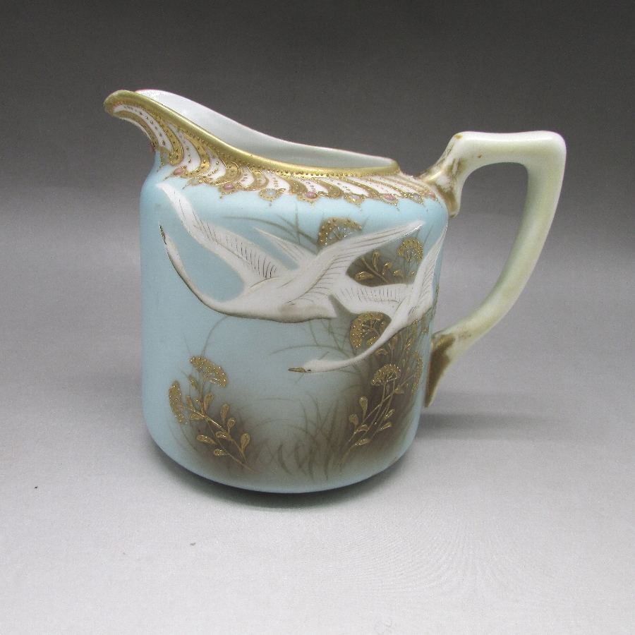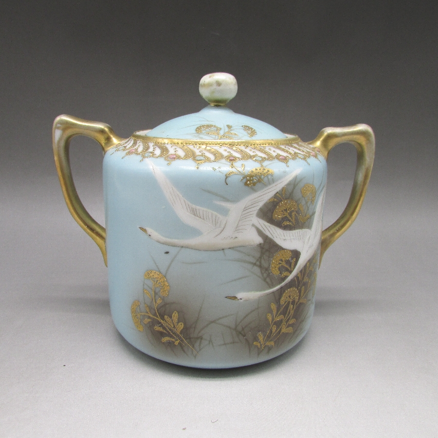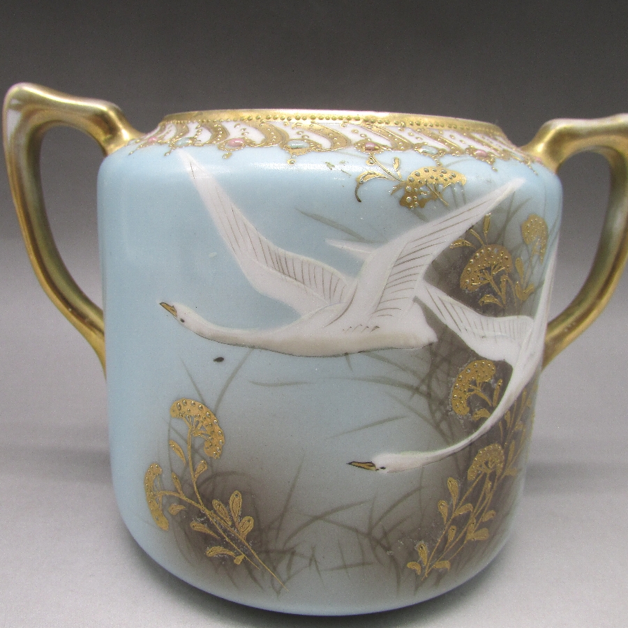 オールドノリタケのフライングスワンシュガー&クリーマーです。1911年頃~1921年頃にアメリカに輸出され、約100年の時を経て日本に里帰りしてきました。オールドノリタケは現在のノリタケカンパニーが明治末期から戦前までに製造したアンティーク陶磁器の総称です。豪華絢爛な西洋風絵付け陶磁器は海外で人気を博しました。近年では、約100年という長い歳月を経て日本に里帰りしてきたことで、わが国でも大変人気が高くなっており、美術工芸品として高い地位を確保しつつあります。