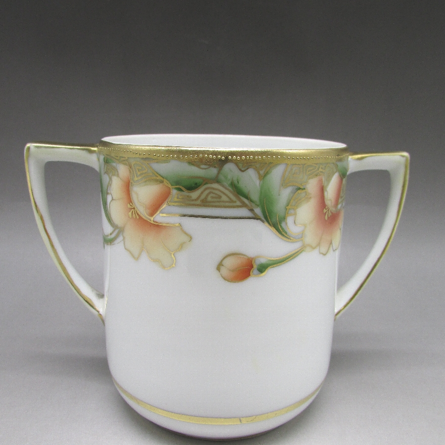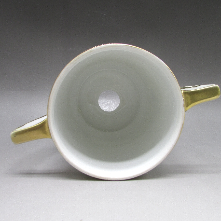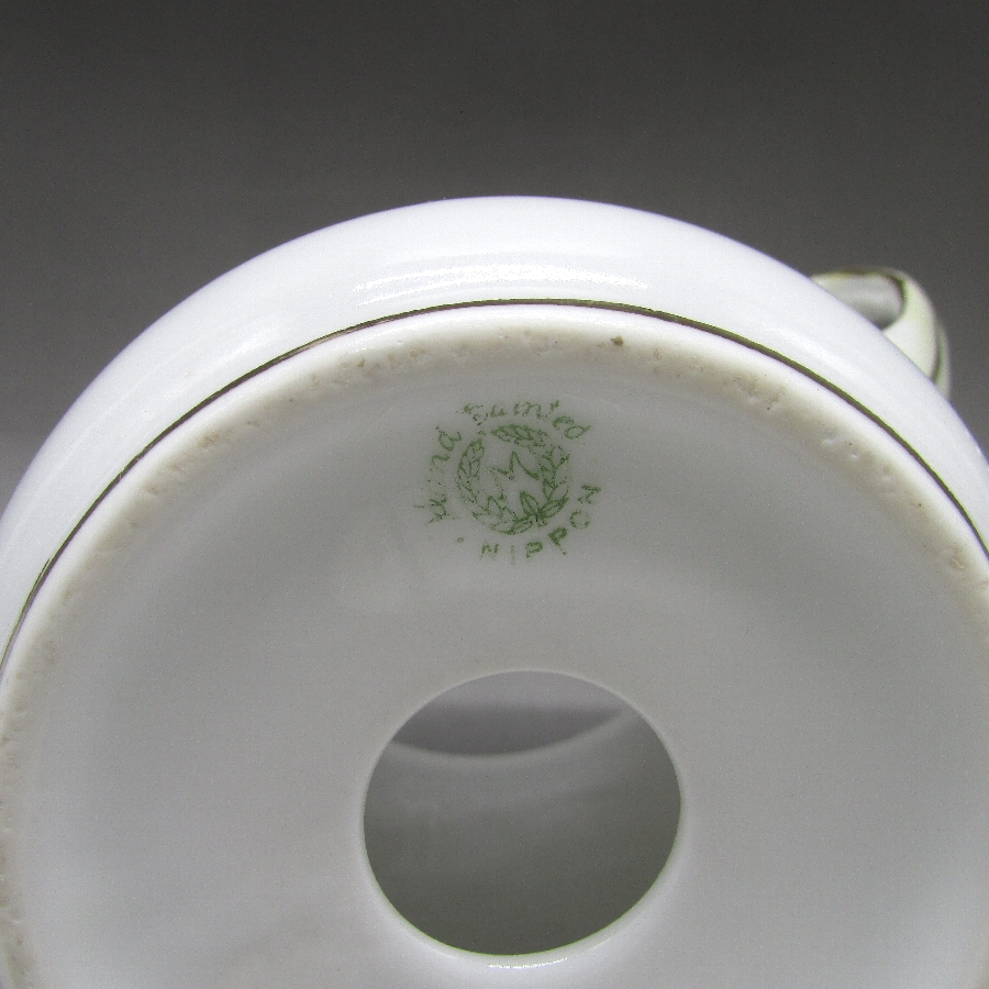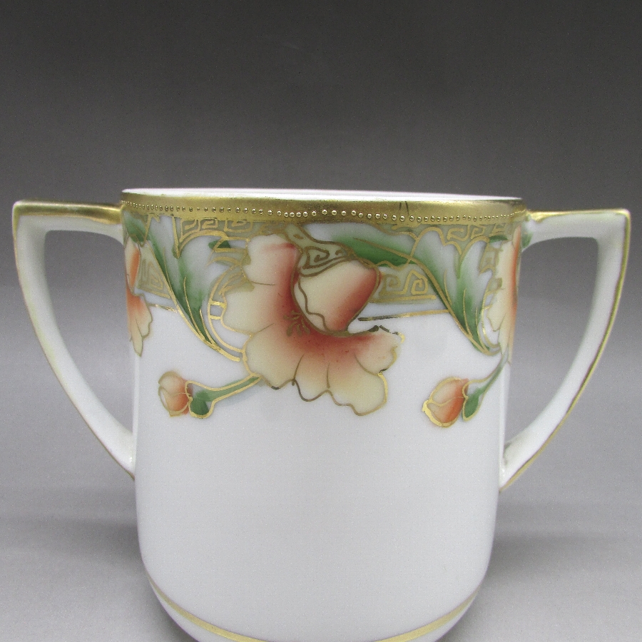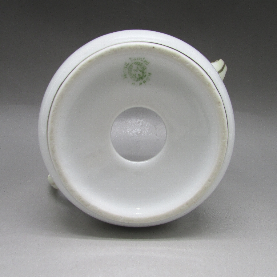 オールドノリタケの花文コンデンスミルク入れです。1911年頃~1921年頃にアメリカに輸出され、約100年の時を経て日本に里帰りしてきました。オールドノリタケは現在のノリタケカンパニーが明治末期から戦前までに製造したアンティーク陶磁器の総称です。豪華絢爛な西洋風絵付け陶磁器は海外で人気を博しました。近年では、約100年という長い歳月を経て日本に里帰りしてきたことで、わが国でも大変人気が高くなっており、美術工芸品として高い地位を確保しつつあります。