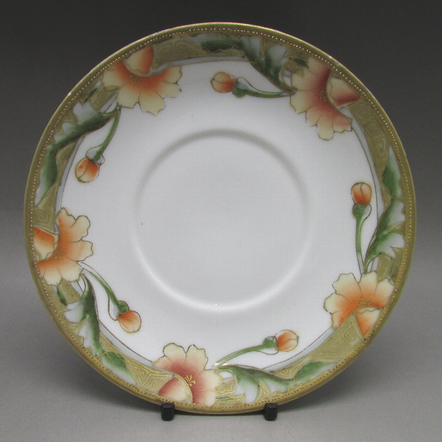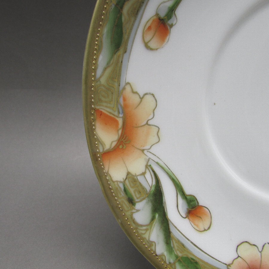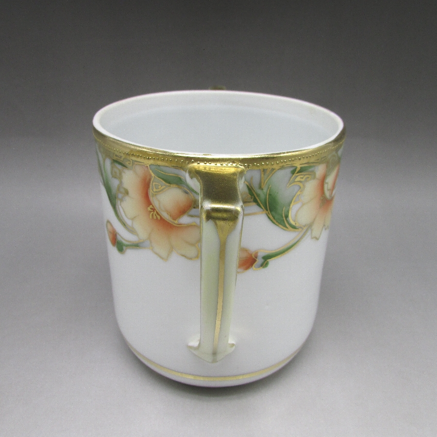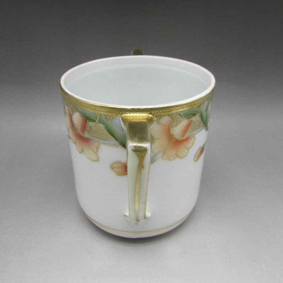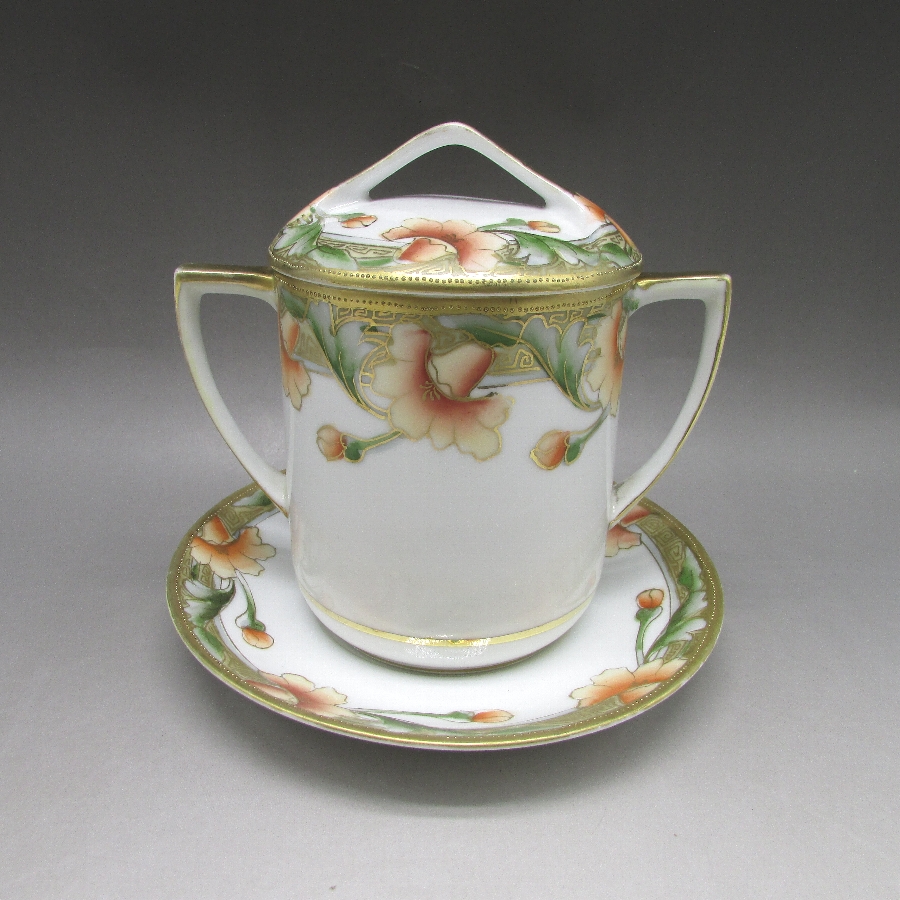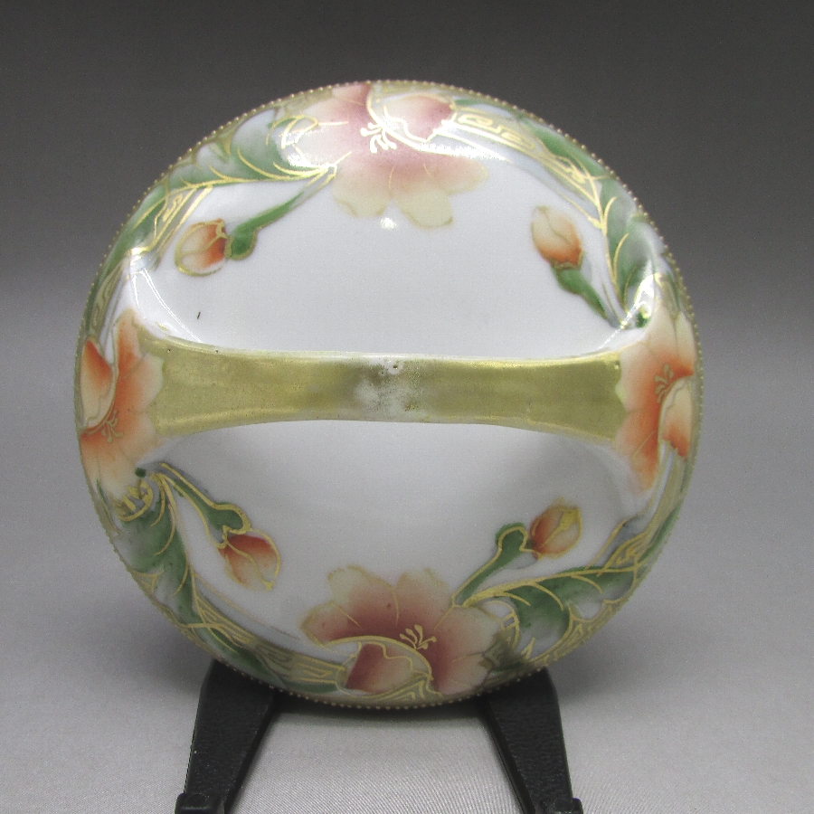 オールドノリタケの花文コンデンスミルク入れです。1911年頃~1921年頃にアメリカに輸出され、約100年の時を経て日本に里帰りしてきました。オールドノリタケは現在のノリタケカンパニーが明治末期から戦前までに製造したアンティーク陶磁器の総称です。豪華絢爛な西洋風絵付け陶磁器は海外で人気を博しました。近年では、約100年という長い歳月を経て日本に里帰りしてきたことで、わが国でも大変人気が高くなっており、美術工芸品として高い地位を確保しつつあります。