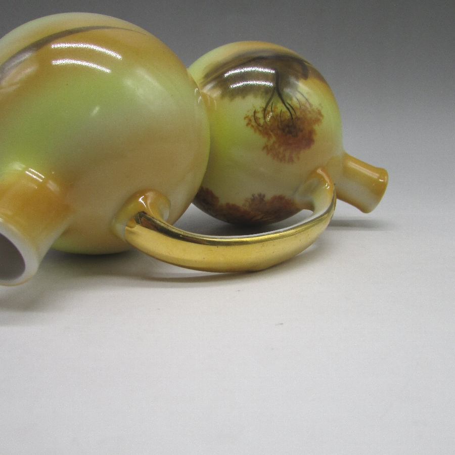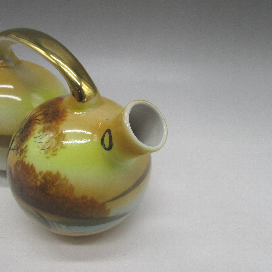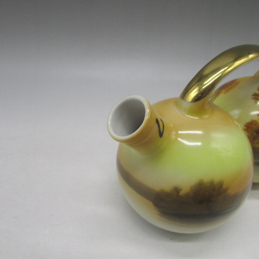 オールドノリタケの夕焼湖畔文オイルポットです。1921年頃~1941年頃にアメリカに輸出され、約100年の時を経て日本に里帰りしてきました。アメリカでは「TREE