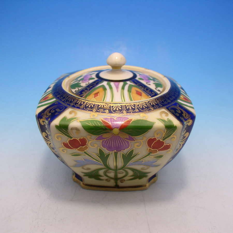 オールドノリタケの蒼地シノワズリ花文カバーボックスです。1906年頃~1925年頃にイギリスに輸出され、約100年の時を経て日本に里帰りしてきました。オールドノリタケは現在のノリタケカンパニーが明治末期から戦前までに製造したアンティーク陶磁器の総称です。豪華絢爛な西洋風絵付け陶磁器は海外で人気を博しました。近年では、約100年という長い歳月を経て日本に里帰りしてきたことで、わが国でも大変人気が高くなっており、美術工芸品として高い地位を確保しつつあります。