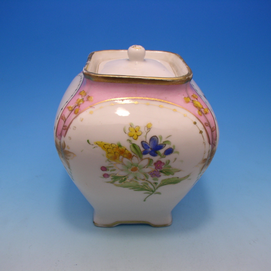 オールドノリタケの桃地小花文ティーリーフジャーです。1911年頃~1921年頃にアメリカに輸出され、約100年の時を経て日本に里帰りしてきました。オールドノリタケは現在のノリタケカンパニーが明治末期から戦前までに製造したアンティーク陶磁器の総称です。豪華絢爛な西洋風絵付け陶磁器は海外で人気を博しました。近年では、約100年という長い歳月を経て日本に里帰りしてきたことで、わが国でも大変人気が高くなっており、美術工芸品として高い地位を確保しつつあります。