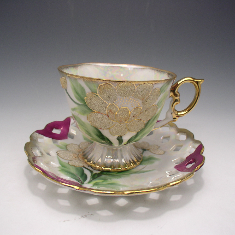 オールド・ジャパンが海外向けに作陶したコラレン装飾を施した花文カップ&ソーサーです。