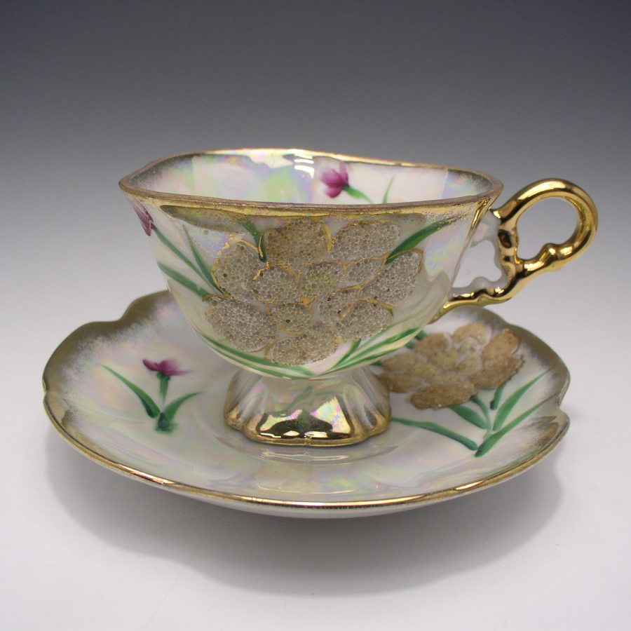 オールド・ジャパンが海外向けに作陶したコラレン装飾を施した花文カップ&ソーサーです。