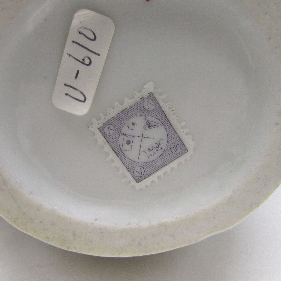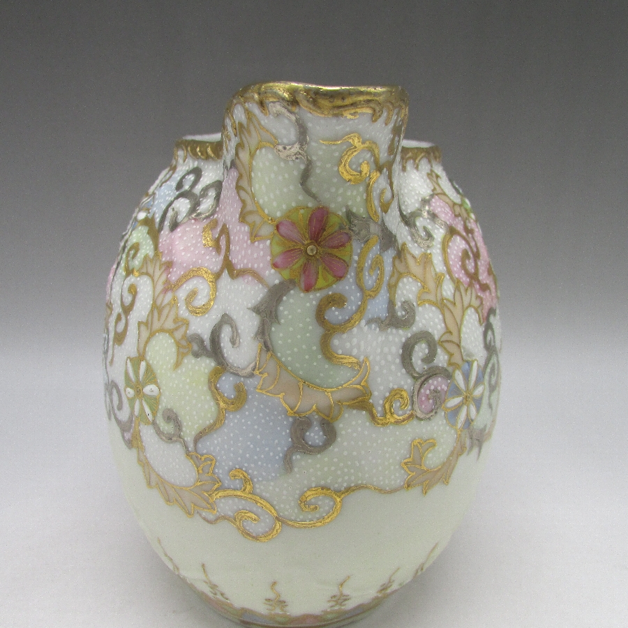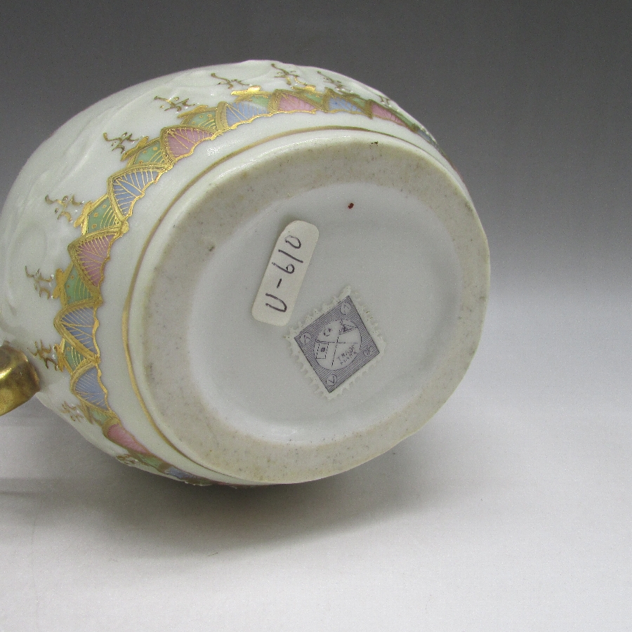 ヴァンタイン商会は外国商社の1つで、1840年代に創業者のA・A・ヴァンタインがアメリカ・サンフランシスコで始めた会社です。日本におけるヴァンタイン商会のビジネスは、1894年頃には転写紙を、後にはラスターも輸入するなど積極的に新技法を取り入れながら、白壁町に生地の見本釜を作ったのが始まりになります。特に注目されるのは、この会社がコラレンという磁胎にビーズを貼り付けた輸出磁器をアメリカ向けに輸出していた点です。ヴァンタイン商会の日米貿易は1920年頃まで続いていたようですが、創業者が没して1951年頃に終わりを迎えたようです。