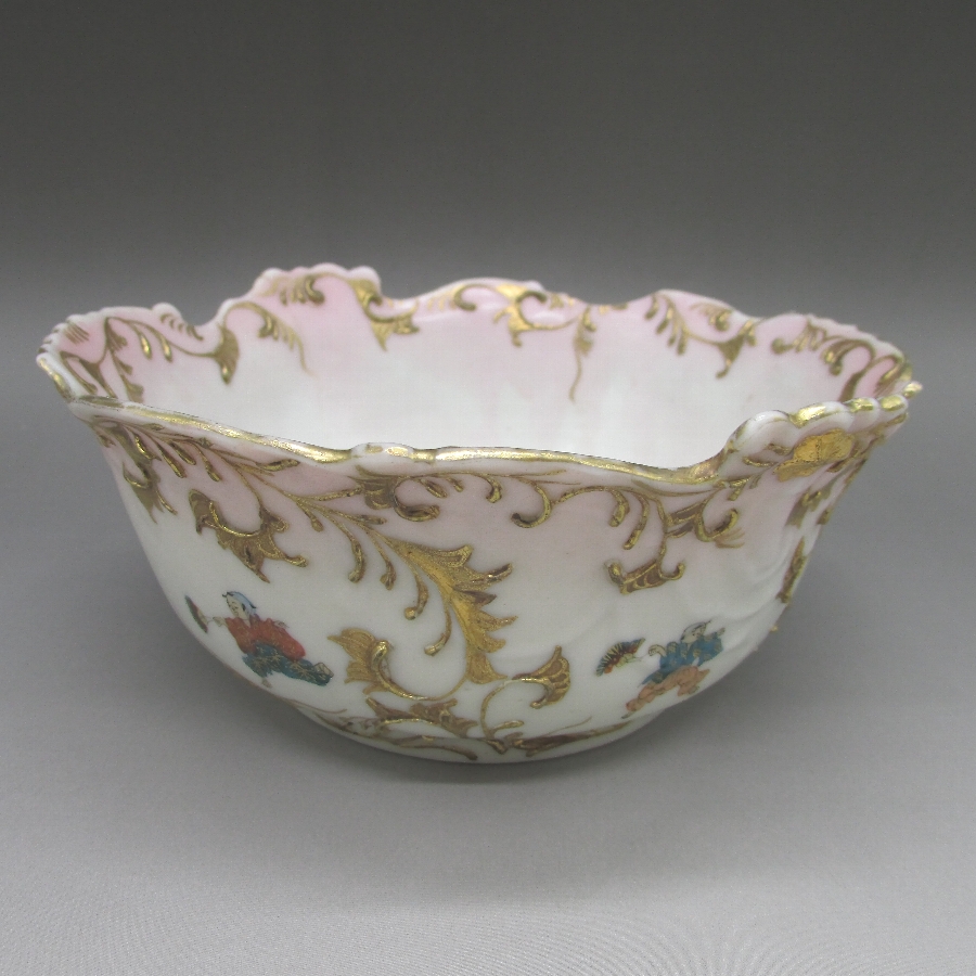 ヴァンタイン商会とはは外国商社の1つで、1840年代に創業者のA・A・ヴァンタインがアメリカ・サンフランシスコで始めた会社です。日本におけるヴァンタイン商会のビジネスは、1894年頃には転写紙を、後にはラスターも輸入するなど積極的に新技法を取り入れながら、白壁町に生地の見本釜を作ったのが始まりになります。特に注目されるのは、この会社がコラレンという磁胎にビーズを貼り付けた輸出磁器をアメリカ向けに輸出していた点です。ヴァンタイン商会の日米貿易は1920年頃まで続いていたようですが、創業者が没して1951年頃に終わりを迎えたようです。