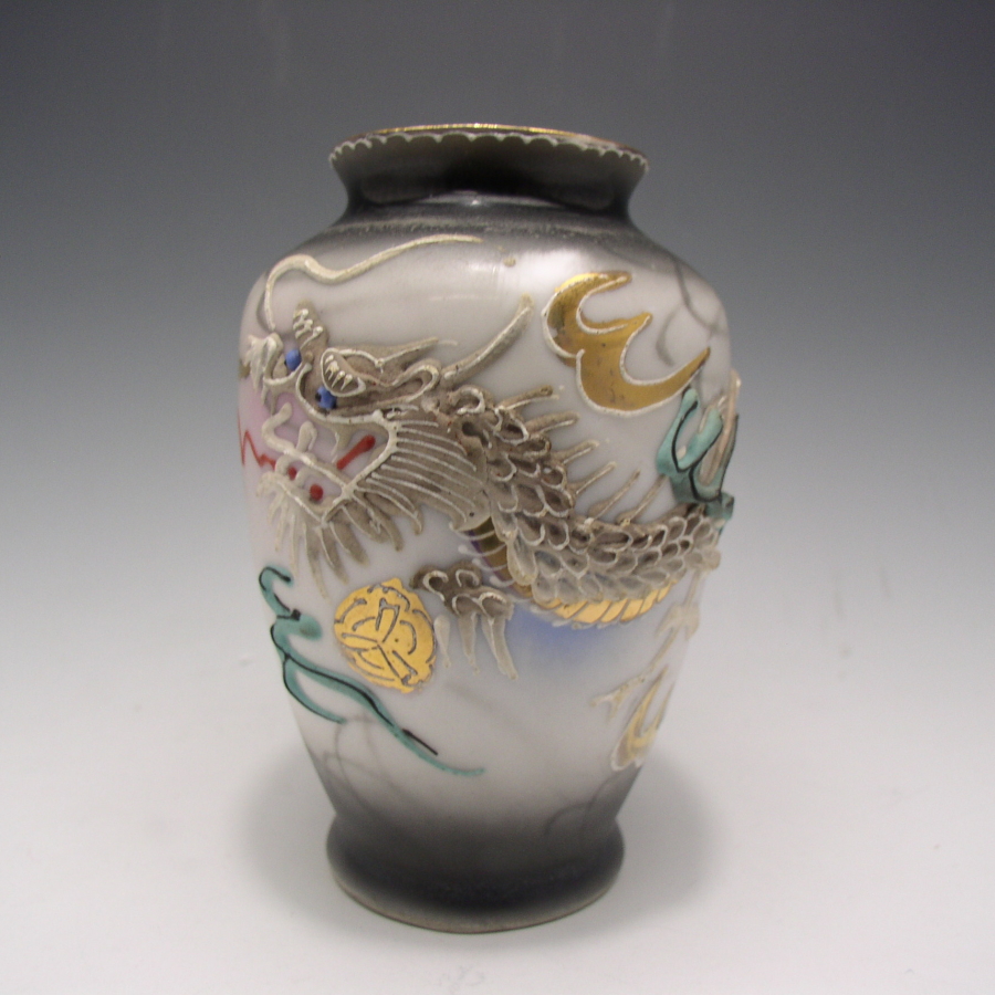 松風陶器が主に欧米諸国向けに作陶した龍盛上花瓶です。松風陶器とは日本で最初の高級陶歯を手がけた会社です。京都の3代・松風嘉定が輸出向けの磁器の製造を目的として1906年に京都に設立した会社です。本社では石版転写画上絵付けを行い、同時に名古屋に支店を設け輸出向けのファンシー製品を製造しました。1922年には松風陶歯製造株式会社を設立し、日本で最初の高級陶歯の製造をスタートしました。