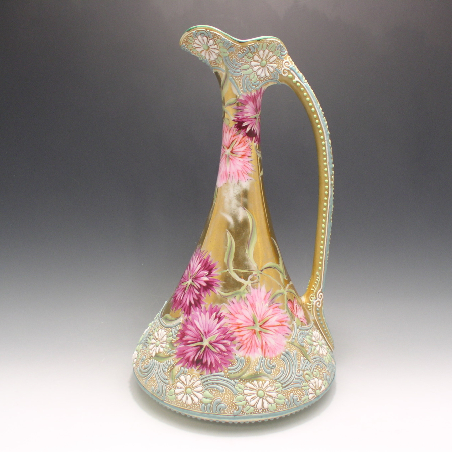 ロイヤルモリエが主に欧米諸国向けに作陶した盛り上げ金彩花文水差です。ロイヤルモリエとは森村組や日本陶器(現ノリタケカンパニーリミテッド)が明治・大正時代に主に欧米諸国に輸出していた時期と同時期に海を渡った日本製の陶磁器の総称です。資料が非常に