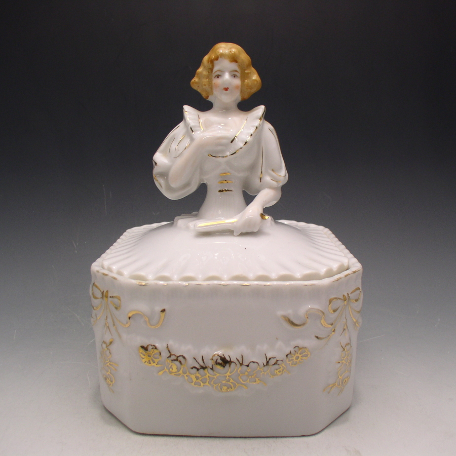 瀬栄陶器が主に欧米諸国向けに作陶した婦人型シュガーポットです。瀬栄陶器とは半磁器のノリタケと呼ばれ、1896年に瀬戸地方の有力窯屋の共同販売会社として設立された会社です。1919年に水野商店と合併した後、1929年には半磁器の生地製造工場を建設し、その生地は白く緻密であり、”半磁器のノリタケ”と呼ばれたそうです。昭和初期にはノリタケから注文を受けてアールデコ風のフィギュアなどを製造したようですが、残念ながら1983年頃に解散したようです。