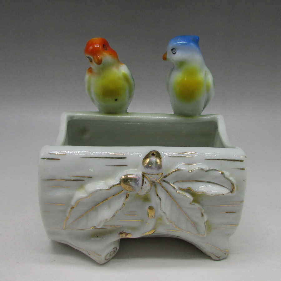 田代商店が主に欧米諸国向けに作陶した鳥二体フィギュア付ファーナーです。田代商店とはセント・ルイス万博の銀賞受賞社です。西洋コバルト顔料の輸入商社の松村九助商店の横浜支店の営業権を田代市郎次が譲り受けて、1880年頃に生まれた会社です。その後、松村九助が名古屋の武平町に生地工場を建設し、七間町から移転することになり、その七間町に田代商店の名古屋支店を開設しています。その後、1900年のパリ万博に陶磁器を多数出品し、1904年のセント・ルイス万博博覧会では、美術の項で銀賞受賞、1910年の日英万国博覧会では陶磁器の項で金賞受賞しています。