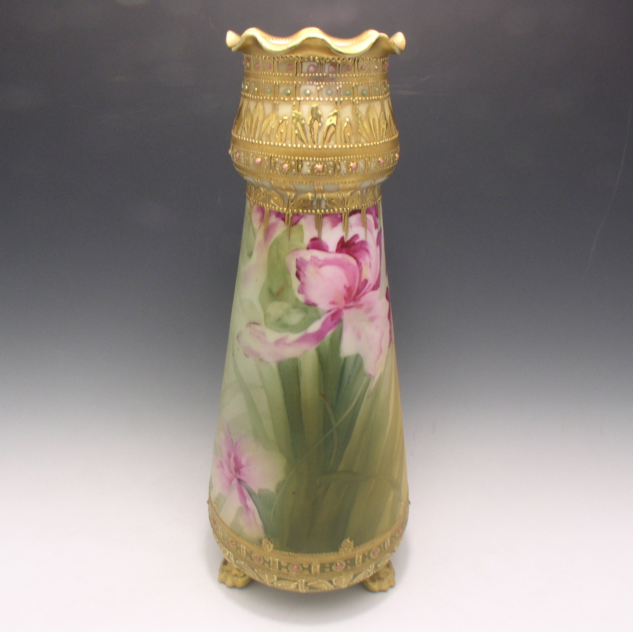 オールドノリタケの金盛ジュール花文花瓶です。1891年頃~1915年頃にアメリカに輸出され、約100年の時を経て日本に里帰りしてきました。オールドノリタケは現在のノリタケカンパニーが明治末期から戦前までに製造したアンティーク陶磁器の総称です。豪華絢爛な西洋風絵付け陶磁器は海外で人気を博しました。近年では、約100年という長い歳月を経て日本に里帰りしてきたことで、わが国でも大変人気が高くなっており、美術工芸品として高い地位を確保しつつあります。