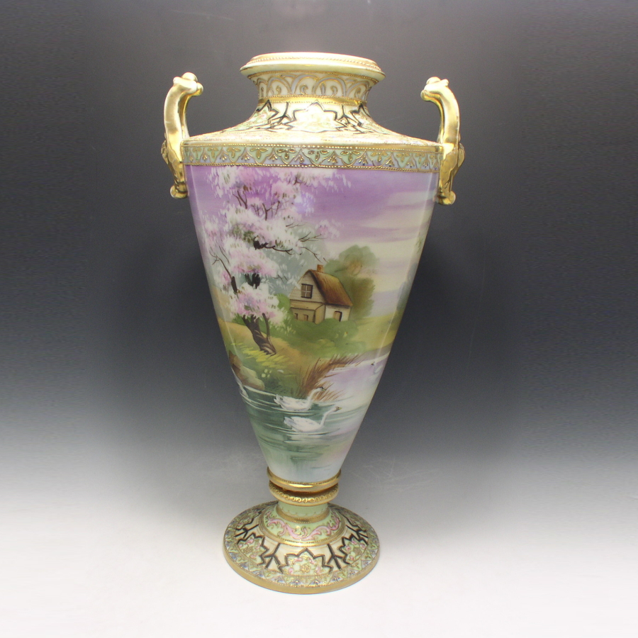 オールドノリタケ 桜コテージ湖畔白鳥文花瓶