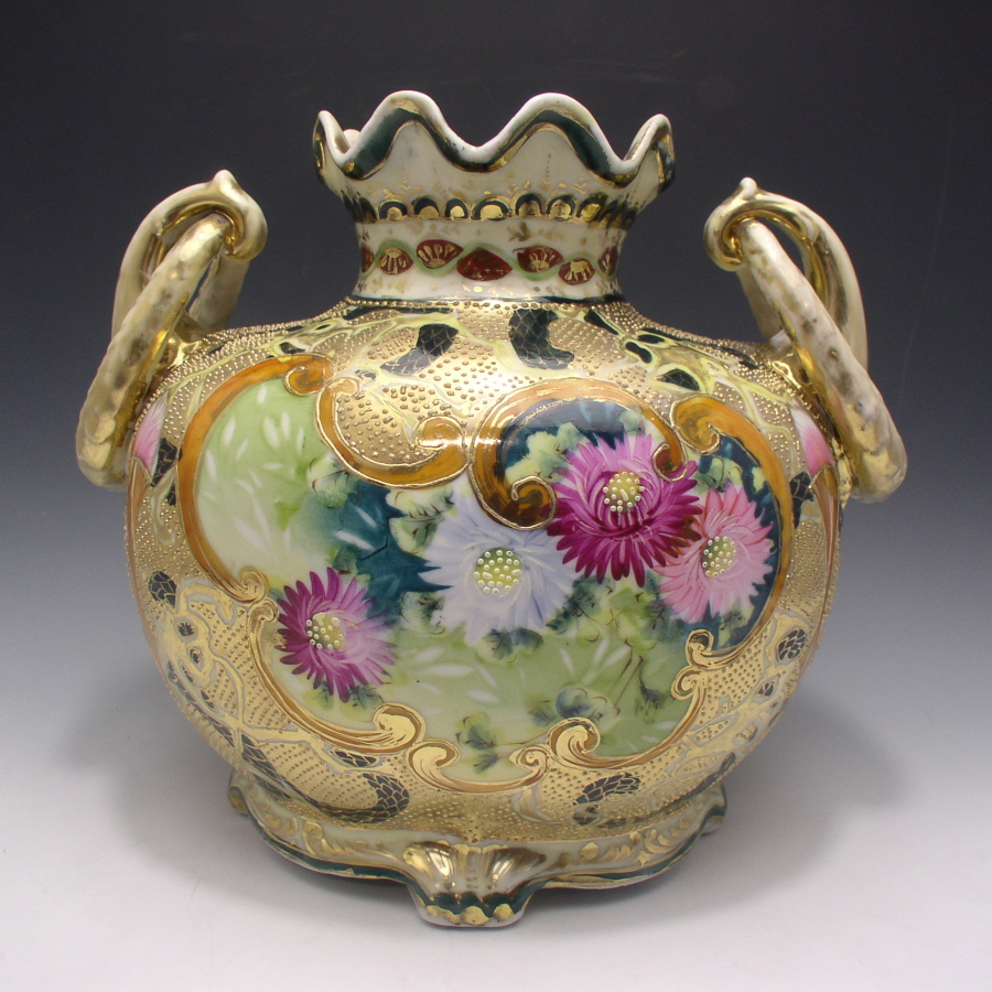 オールドノリタケの金盛草花文両耳付花瓶です。1891年頃~1915年頃にアメリカに輸出され、約100年の時を経て日本に里帰りしてきました。オールドノリタケは現在のノリタケカンパニーが明治末期から戦前までに製造したアンティーク陶磁器の総称です。豪華絢爛な西洋風絵付け陶磁器は海外で人気を博しました。近年では、約100年という長い歳月を経て日本に里帰りしてきたことで、わが国でも大変人気が高くなっており、美術工芸品として高い地位を確保しつつあります。