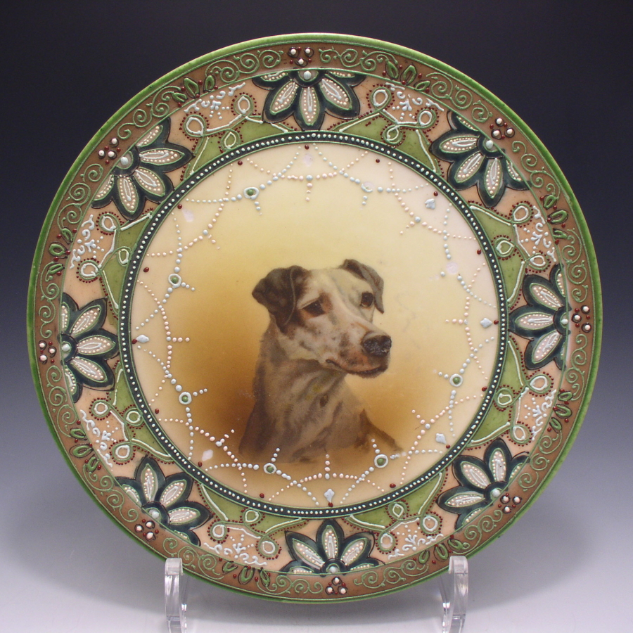 オールドノリタケの犬文盛上飾皿です。1891年頃~1915年頃にアメリカに輸出され、約100年の時を経て日本に里帰りしてきました。オールドノリタケは現在のノリタケカンパニーが明治末期から戦前までに製造したアンティーク陶磁器の総称です。豪華絢爛な西洋風絵付け陶磁器は海外で人気を博しました。近年では、約100年という長い歳月を経て日本に里帰りしてきたことで、わが国でも大変人気が高くなっており、美術工芸品として高い地位を確保しつつあります。
