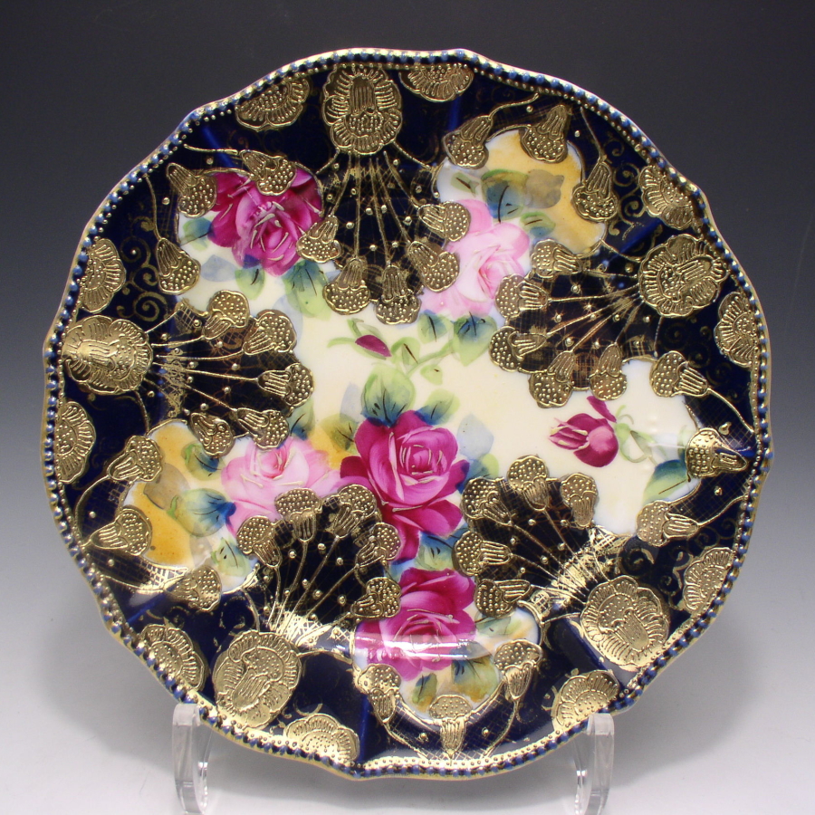 オールドノリタケのコバルト金盛花文プレートです。1891年頃~1915年頃にアメリカに輸出され、約100年の時を経て日本に里帰りしてきました。オールドノリタケは現在のノリタケカンパニーが明治末期から戦前までに製造したアンティーク陶磁器の総称です。豪華絢爛な西洋風絵付け陶磁器は海外で人気を博しました。近年では、約100年という長い歳月を経て日本に里帰りしてきたことで、わが国でも大変人気が高くなっており、美術工芸品として高い地位を確保しつつあります。