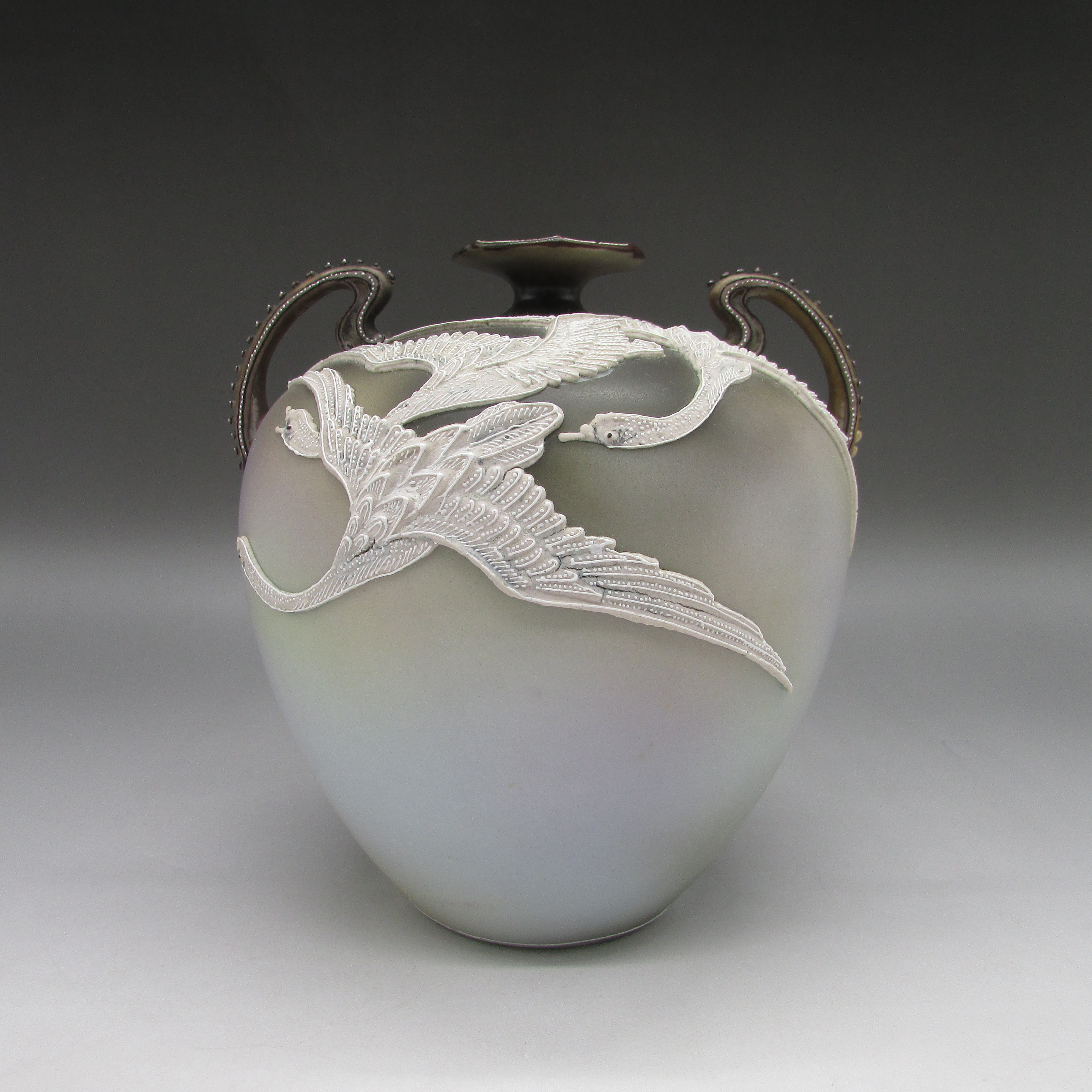 オールドノリタケの白鳥盛上両耳付花瓶です。1891年頃~1915年頃にアメリカに輸出され、約100年の時を経て日本に里帰りしてきました。オールドノリタケは現在のノリタケカンパニーが明治末期から戦前までに製造したアンティーク陶磁器の総称です。豪華絢爛な西洋風絵付け陶磁器は海外で人気を博しました。近年では、約100年という長い歳月を経て日本に里帰りしてきたことで、わが国でも大変人気が高くなっており、美術工芸品として高い地位を確保しつつあります。