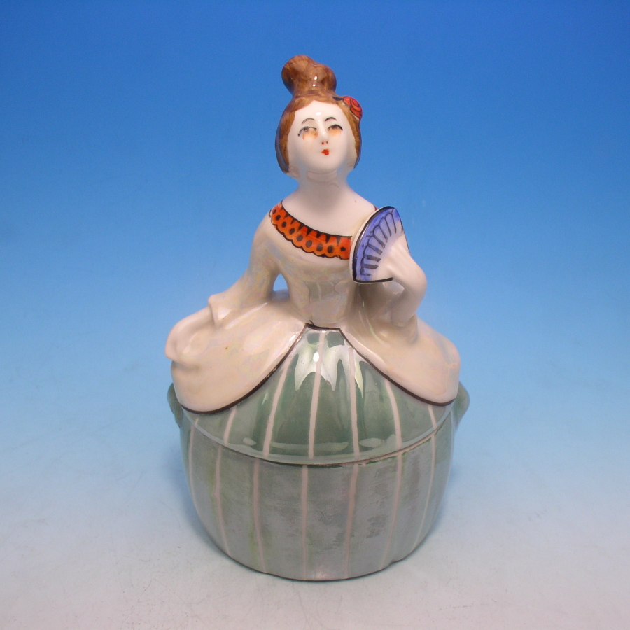 オールドノリタケのデコレディドレッサードールです。1924年頃~1935年頃にアメリカに輸出され、約100年の時を経て日本に里帰りしてきました。オールドノリタケは現在のノリタケカンパニーが明治末期から戦前までに製造したアンティーク陶磁器の総称です。豪華絢爛な西洋風絵付け陶磁器は海外で人気を博しました。近年では、約100年という長い歳月を経て日本に里帰りしてきたことで、わが国でも大変人気が高くなっており、美術工芸品として高い地位を確保しつつあります。