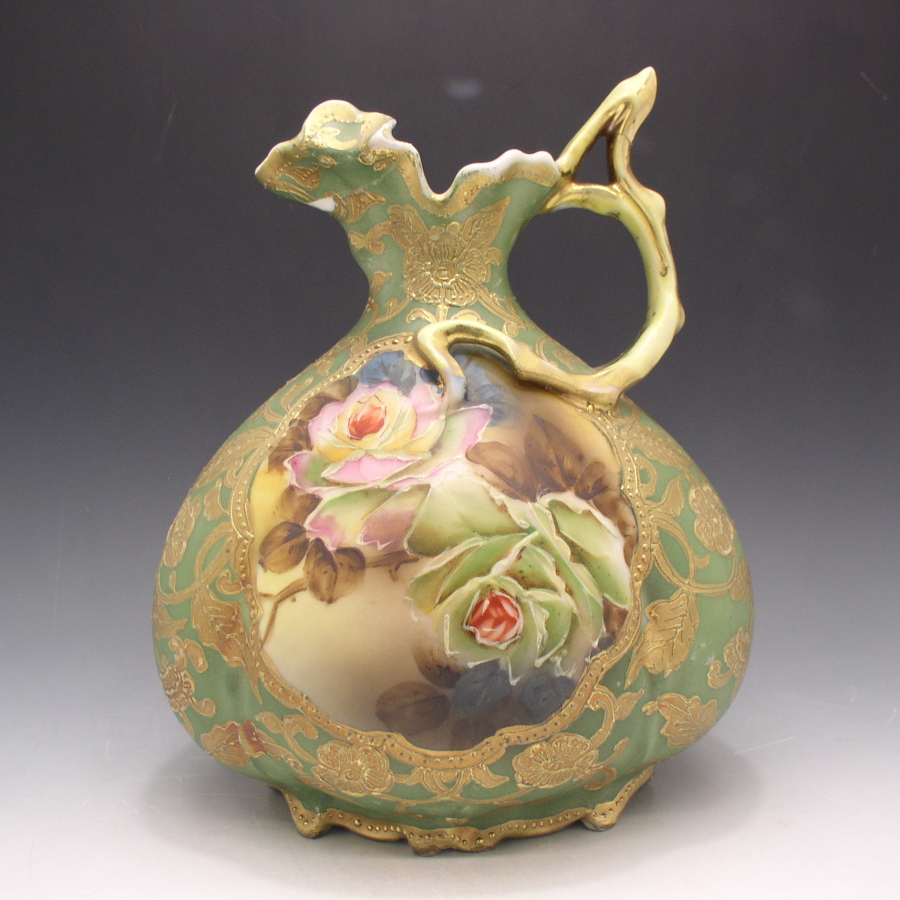 オールドノリタケの金盛薔薇文水差です。1891年頃~1915年頃にアメリカに輸出され、約100年の時を経て日本に里帰りしてきました。オールドノリタケは現在のノリタケカンパニーが明治末期から戦前までに製造したアンティーク陶磁器の総称です。豪華絢爛な西洋風絵付け陶磁器は海外で人気を博しました。近年では、約100年という長い歳月を経て日本に里帰りしてきたことで、わが国でも大変人気が高くなっており、美術工芸品として高い地位を確保しつつあります。