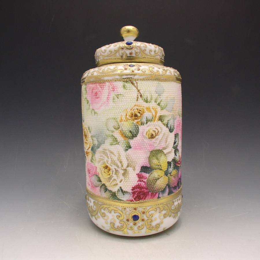 オールドノリタケのタペストリー花文ティーリーフジャーです。1891年頃~1915年頃にアメリカに輸出され、約100年の時を経て日本に里帰りしてきました。オールドノリタケは現在のノリタケカンパニーが明治末期から戦前までに製造したアンティーク陶磁器の総称です。豪華絢爛な西洋風絵付け陶磁器は海外で人気を博しました。近年では、約100年という長い歳月を経て日本に里帰りしてきたことで、わが国でも大変人気が高くなっており、美術工芸品として高い地位を確保しつつあります。