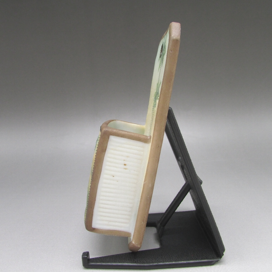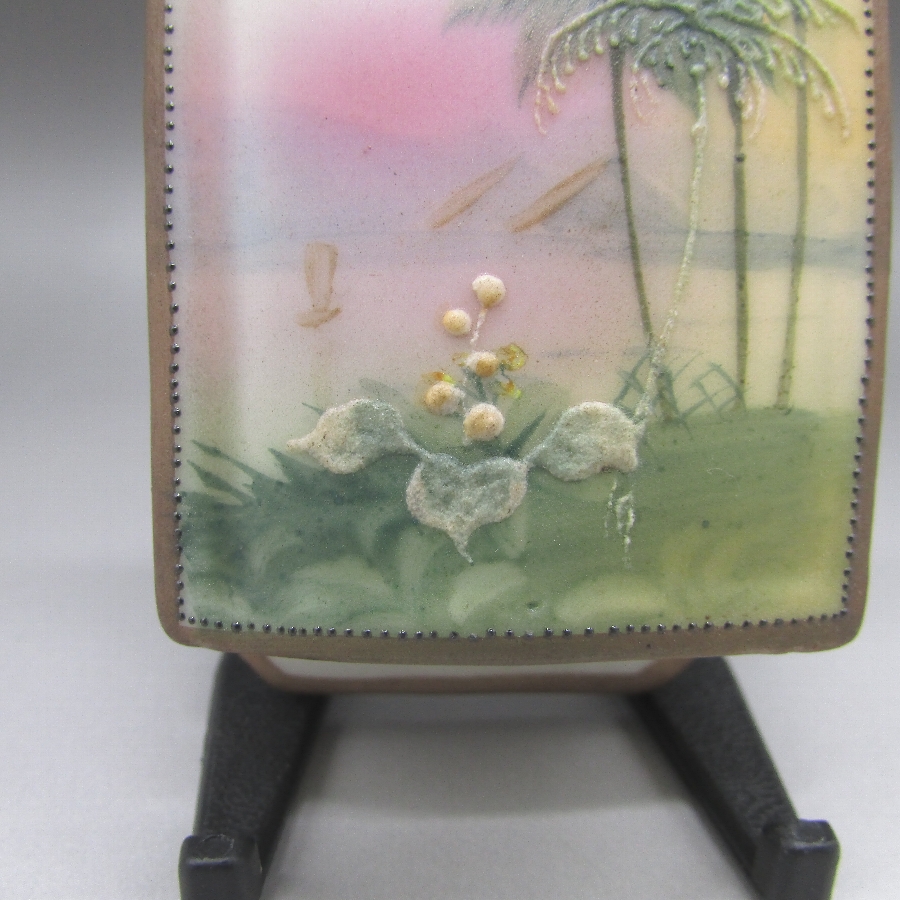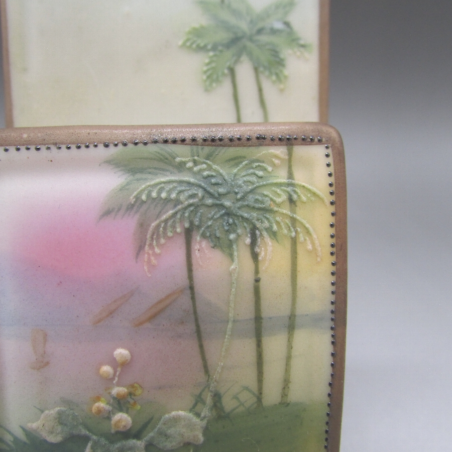 Van Patten/1998・COLLECTOR BOOKS)に同作品が掲載されています。風景画デザインは輸出陶磁器においては明治末期頃から使用されていました。今回は南国デザインの風景画で、アクセントに盛り上げ装飾を用いた手の込んだ仕上がりになっています。盛り上げは、陶磁器を立体的に見せる技法でオールドノリタケの最も代表的な技法です。古くは宋時代の中国や17世紀のイギリスなどにもあったようですが、近代になって広く知られるところとなったのはオールドノリタケによるところが大きいと言われています。今や欧米でも「MORIAGE」という名で通じ程、高く評価されています。装飾方法はデコレーションケーキを飾る時に使用する生クリームを絞り出すような道具を用いて装飾を行います。職人の精緻な装飾技術で、現代では再現不可能な希少な装飾方法です。