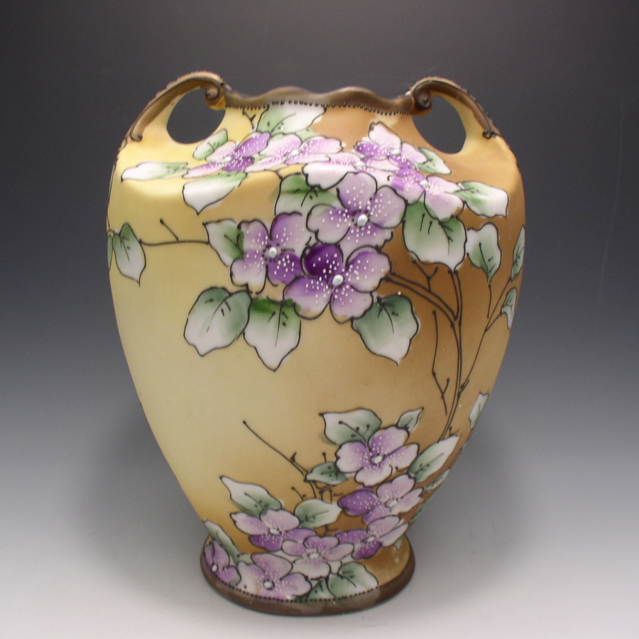 オールド・ニッポンの紫花文茶地花瓶です。明治・大正時代に欧米に輸出され、約100年の時を経て日本に里帰りしてきました。「Collector's Encyclopedia of NIPPON PORCELAIN Identification & Values Fifth Series」(Joan Van Patten/1998・COLLECTOR BOOKS)に同作品が掲載されています。