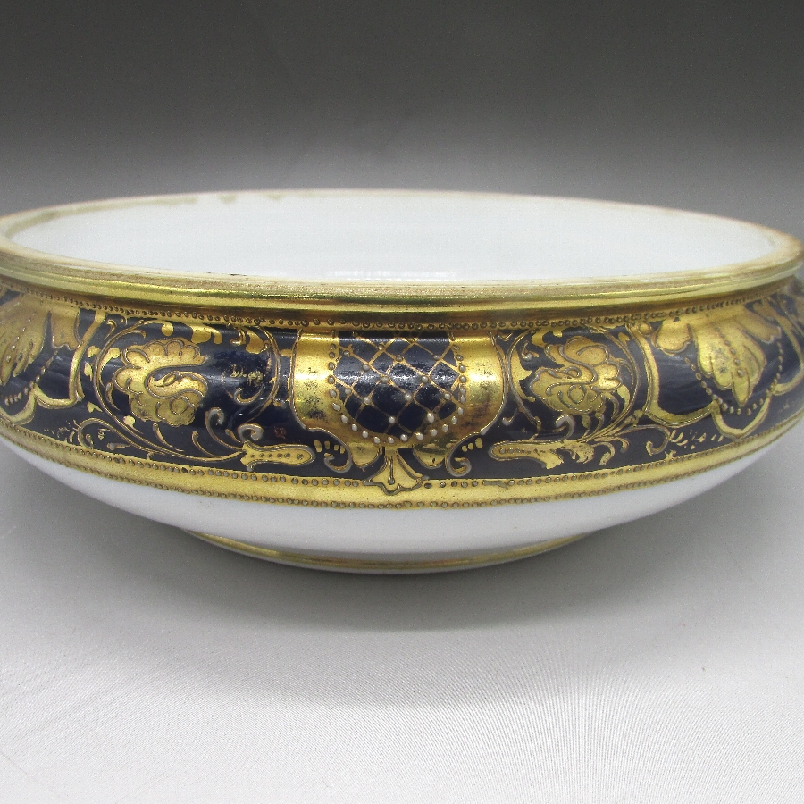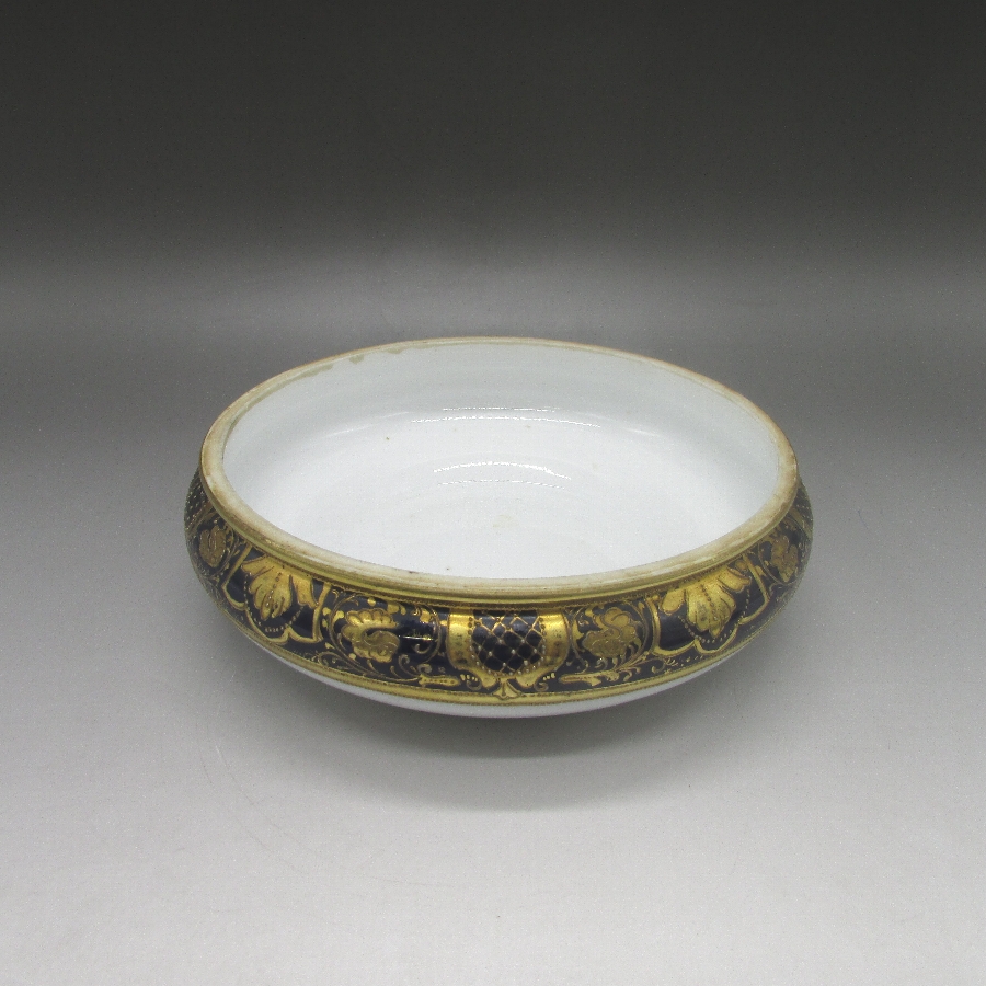 オールドノリタケのコバルト金盛風景文クッキージャーです。1906年頃~1925年頃にイギリスに輸出され、約100年の時を経て日本に里帰りしてきました。外国の湖畔風景にコバルト(瑠璃色)に金盛り装飾を用いた豪華絢爛な逸品作品です。ノリタケのコバルトが素晴らしいのは、王宮の大きな庇護の下で品質を追求した官窯の仏セーブルに対して、民窯として経営と利益を考えた上でこの品質が出来上がる点です。「Noritake
