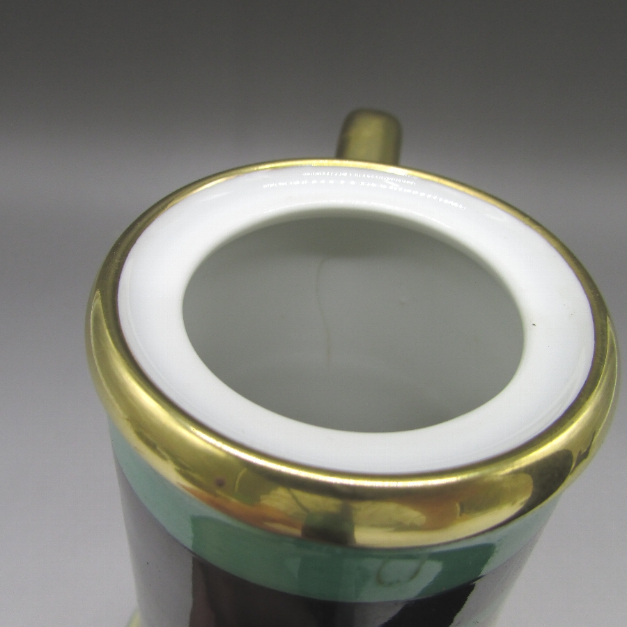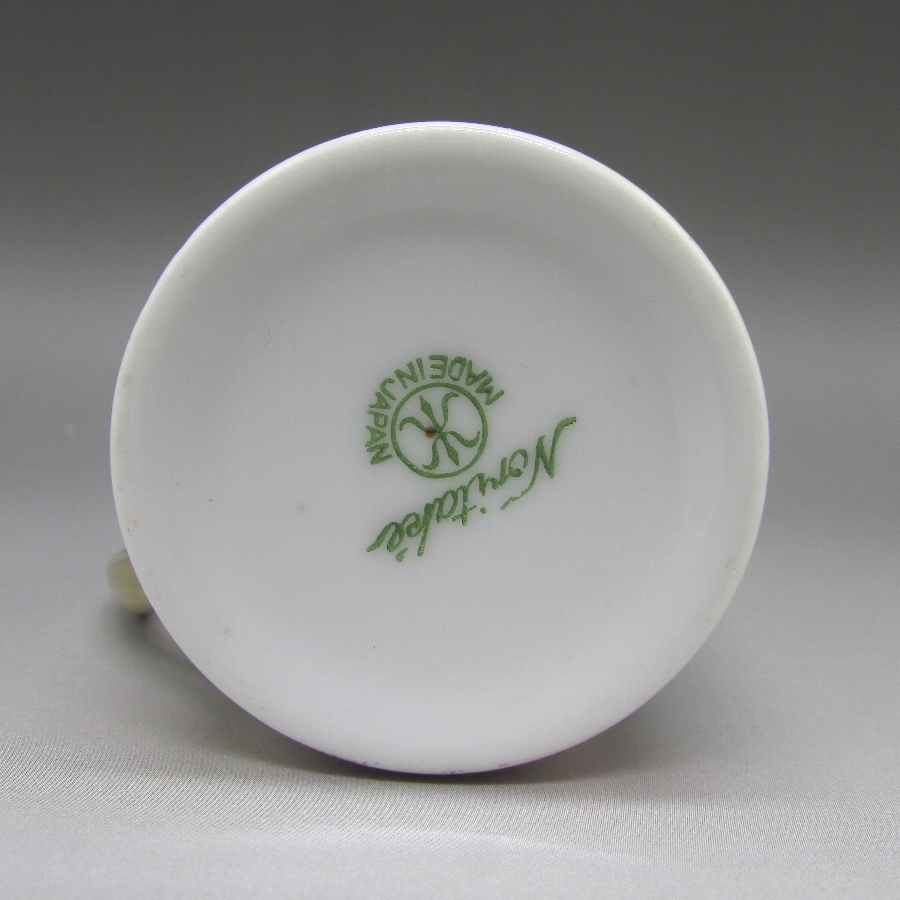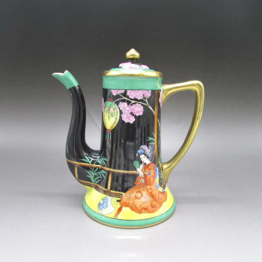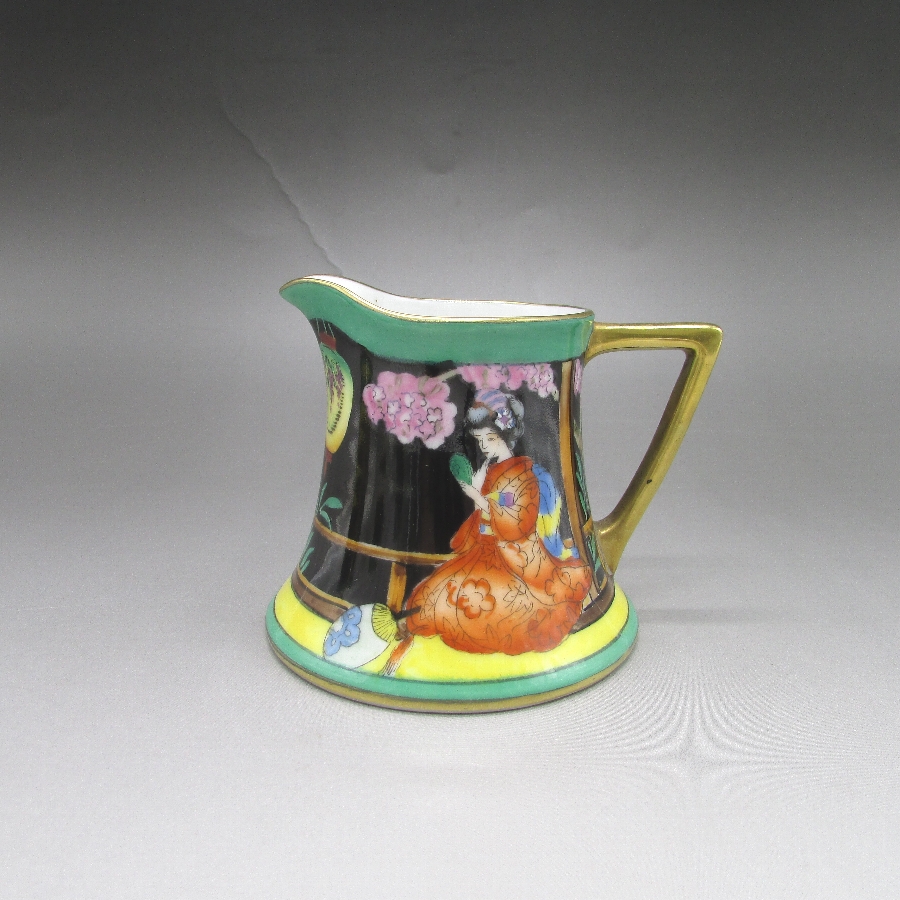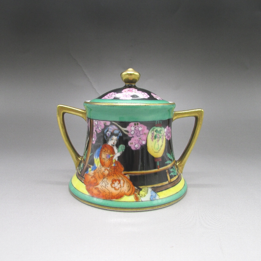 オールドノリタケのオリエンタル芸者文デミタスセットです。1911年頃~1941年頃にイギリスに輸出され、約100年の時を経て日本に里帰りしてきました。ノリタケを中心にした名古屋で絵付けされた女性は「芸者・舞妓」と呼ばれていて、九谷の金襴手での「美人画」とは区分けしたようです。また、輸出先もアメリカではなく、そのほとんどがイギリス向けに輸出されました。おそらく薩摩焼の輸出が関連したものだと思われます。芸者図は明治期に久谷庄三らにより海外へ輸出され、その中でもとりわけ美人画が人気となりました。これらの陶磁器に共通するのは鮮やかな振袖をまとった複数の美人がいて、桜、紅葉、松などの木々が女性を囲み、遠景に富士山や提灯などが描かれた構図です。