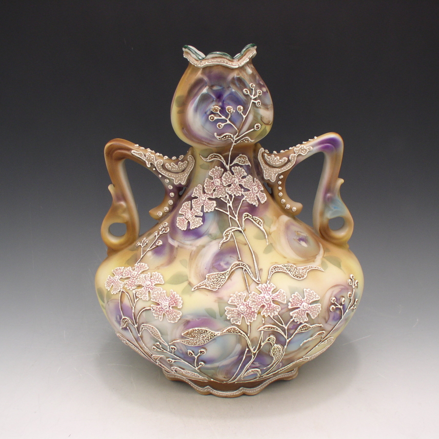 オールド・ニッポンの草花盛上花文花瓶が明治・大正時代に欧米に輸出され、約100年の時を経て日本に里帰りしてきました。盛り上げ装飾は陶磁器を立体的に見せる技法で、欧米でも【MORIAGE】で通用する程、有名な装飾技法です。デコレーションケーキを飾る時に使用する生クリームを絞り出すような道具を用いて装飾を行います。職人の精緻な装飾技術で、現代では再現不可能な希少な装飾方法です。