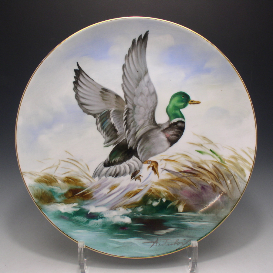 松風陶器が主に欧米諸国向けに作陶したサイン入り鳥文プレートです。松風陶器とは日本で最初の高級陶歯を手がけた会社です。京都の3代・松風嘉定が輸出向けの磁器の製造を目的として1906年に京都に設立した会社です。本社では石版転写画上絵付けを行い、同時に名古屋に支店を設け輸出向けのファンシー製品を製造しました。1922年には松風陶歯製造株式会社を設立し、日本で最初の高級陶歯の製造をスタートしました。