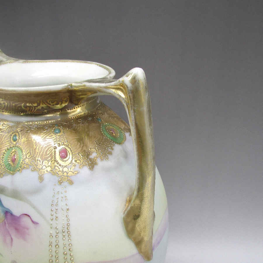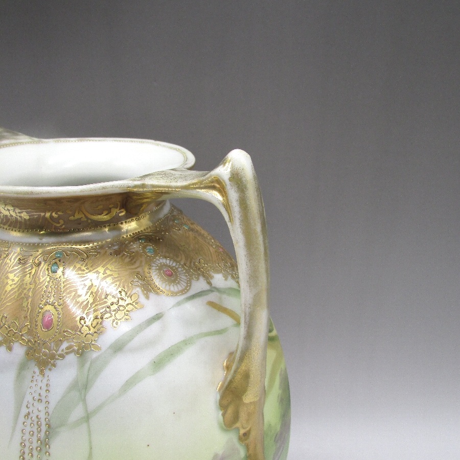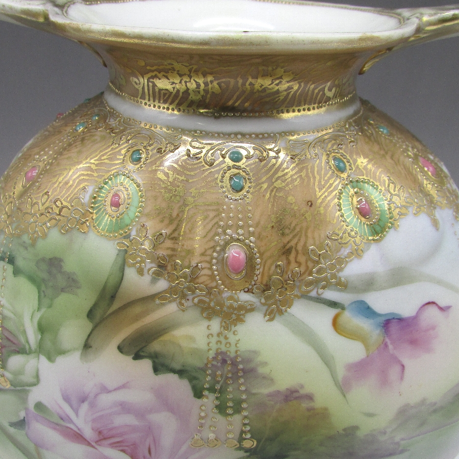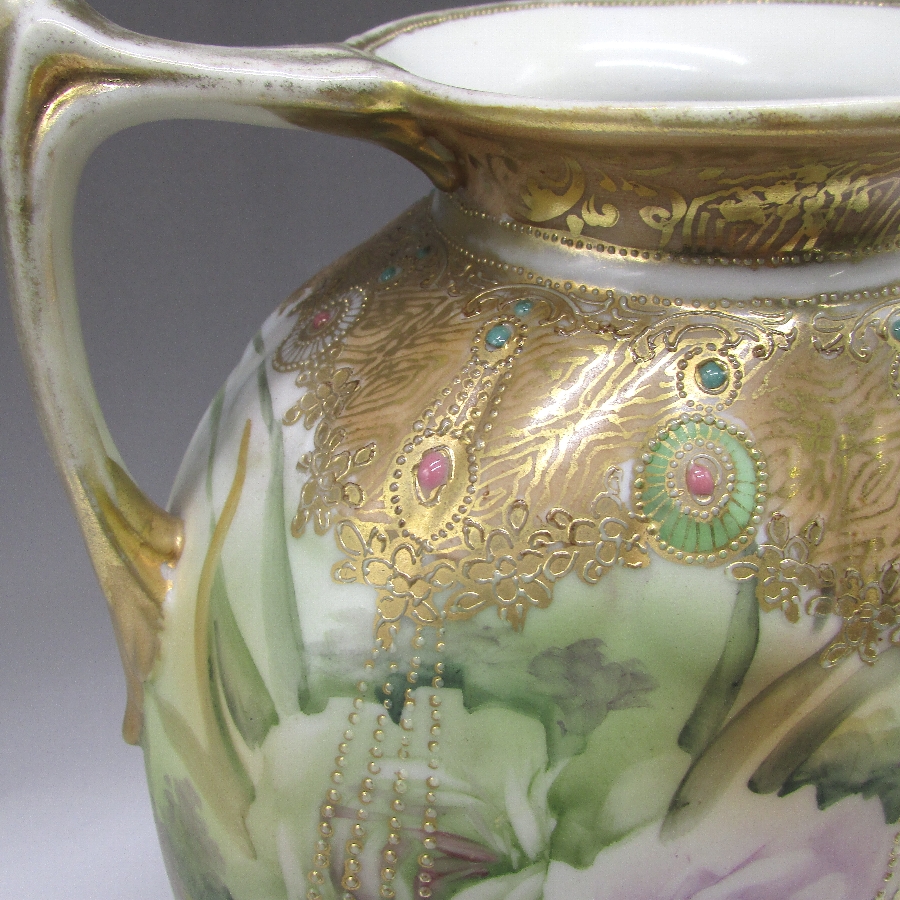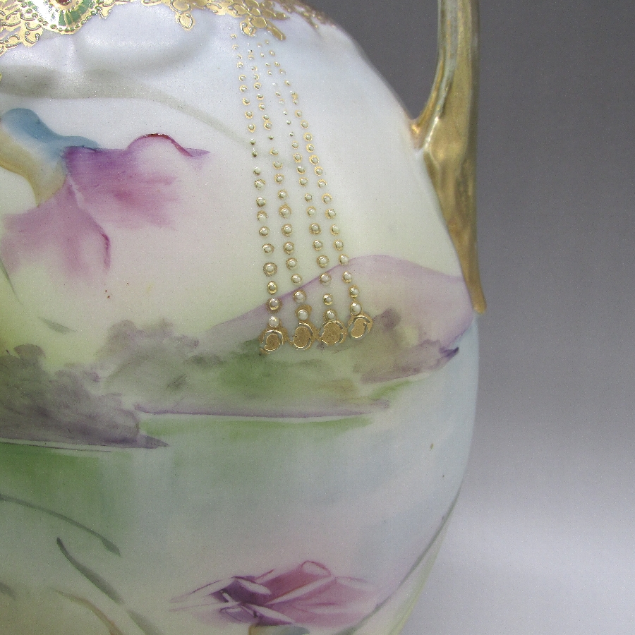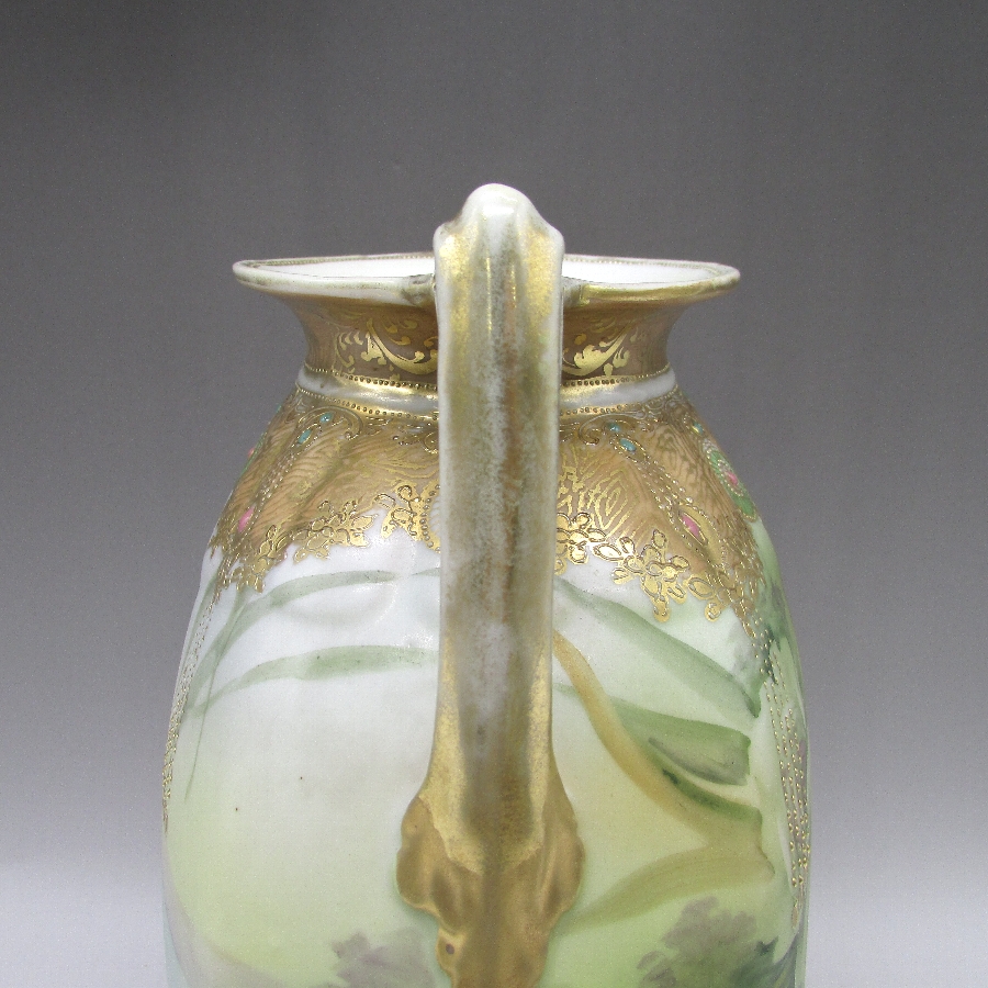 オールドノリタケのジュール湖畔風景花文花瓶です。1891年頃~1915年頃にアメリカに輸出され、約100年の時を経て日本に里帰りしてきました。湖畔を背景に花を描き、周囲を金盛り装飾で仕上げた素晴らしい作品です。金盛り装飾は高級品の代表的な装飾技法で、点、点線、線などを泥漿で描き、焼成した後に金液を筆などで塗り被せて仕上げる技法です。欧米で人気のあった豪華絢爛な仕上がりにするのに最適な技法です。オールドノリタケでよく用いられている金液は金の延棒を濃塩酸と濃硝酸を体積比で3対1に混ぜた溶液で溶解し液状にしたものを使用していました。